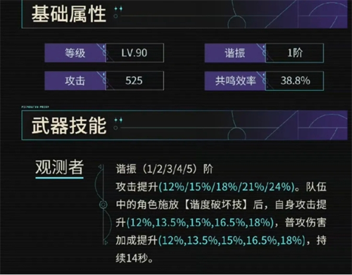 满级时可以为佩戴者提供525的攻击白值和38.8%的共鸣效率,不得不说,这把武器的设计风格还是比较新奇的。