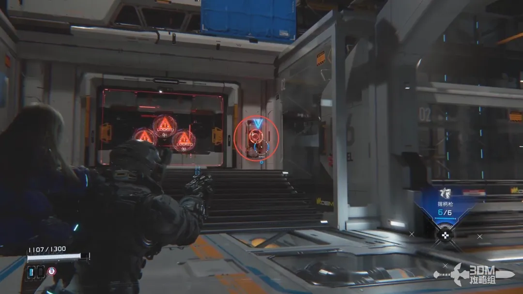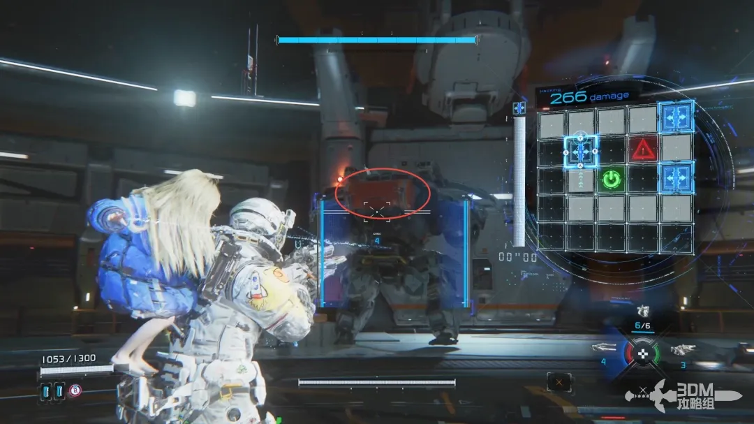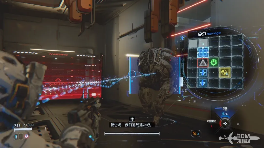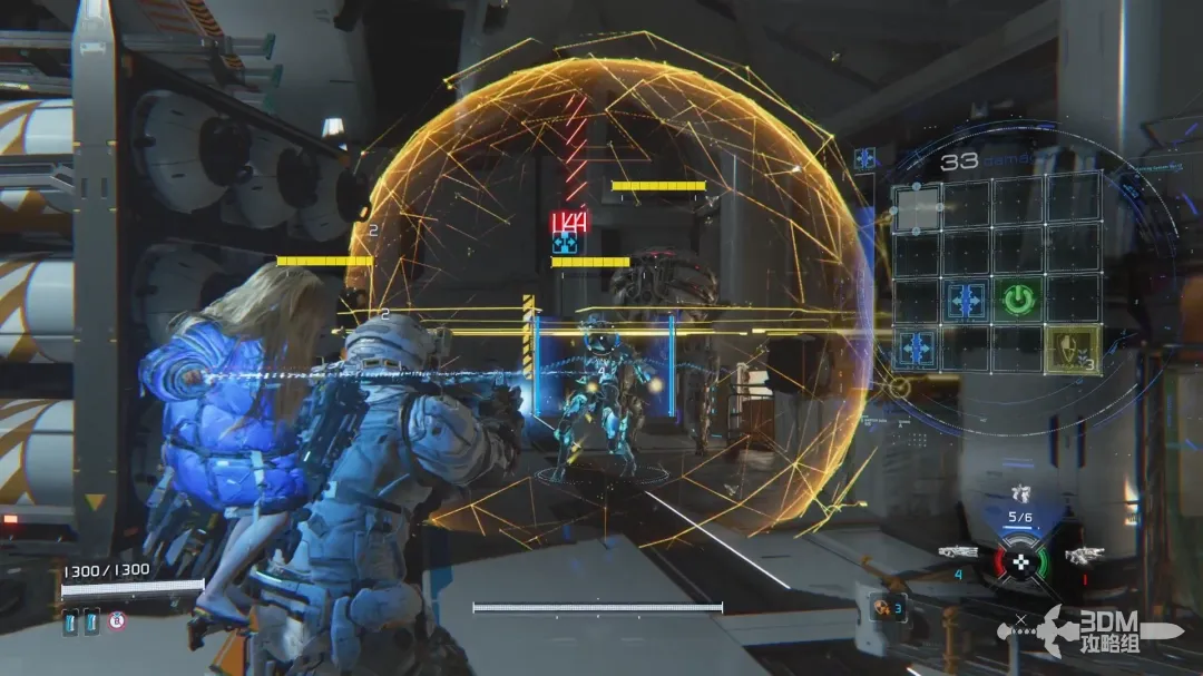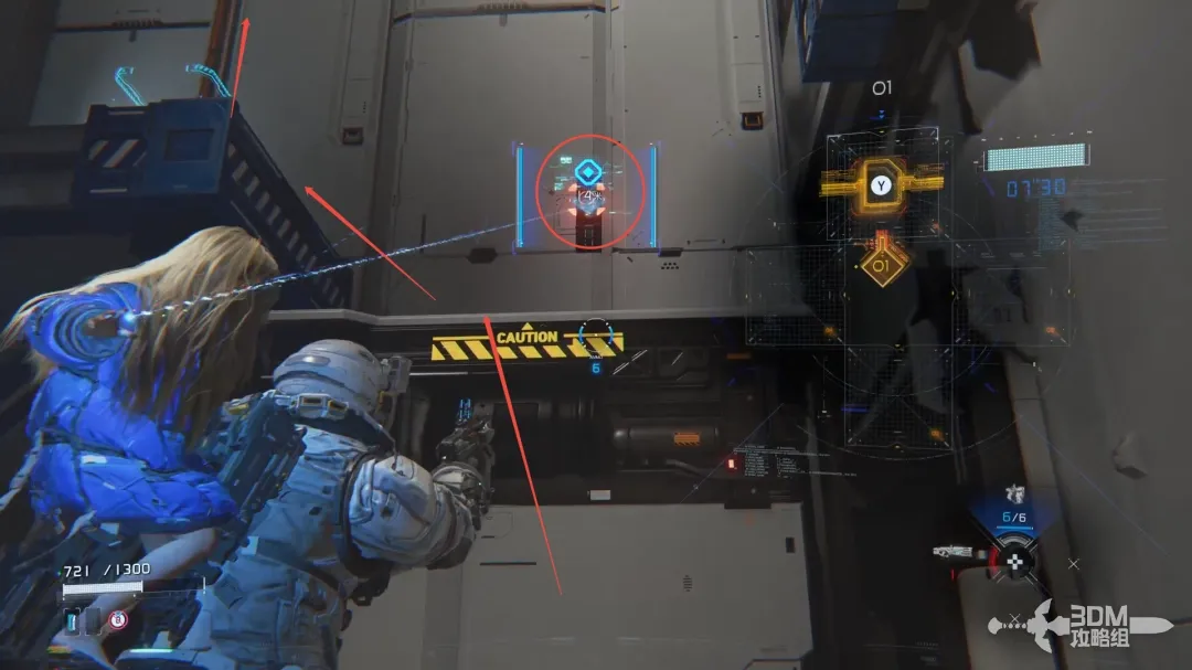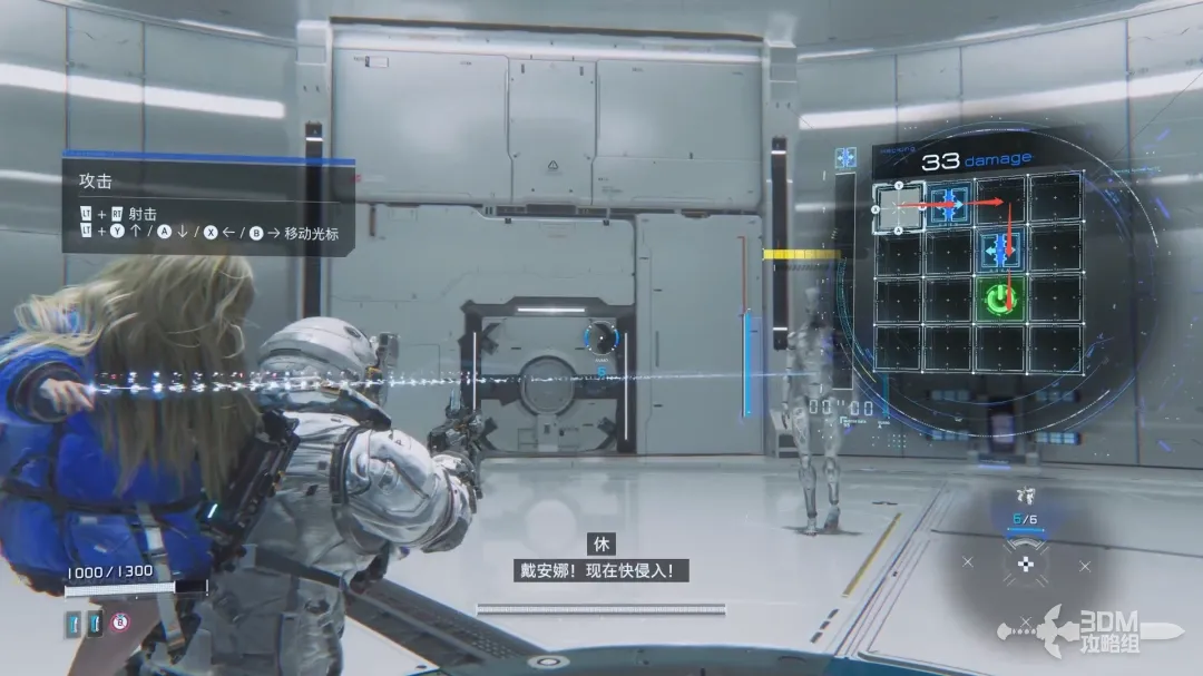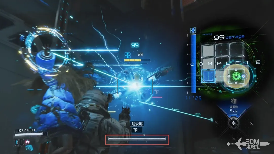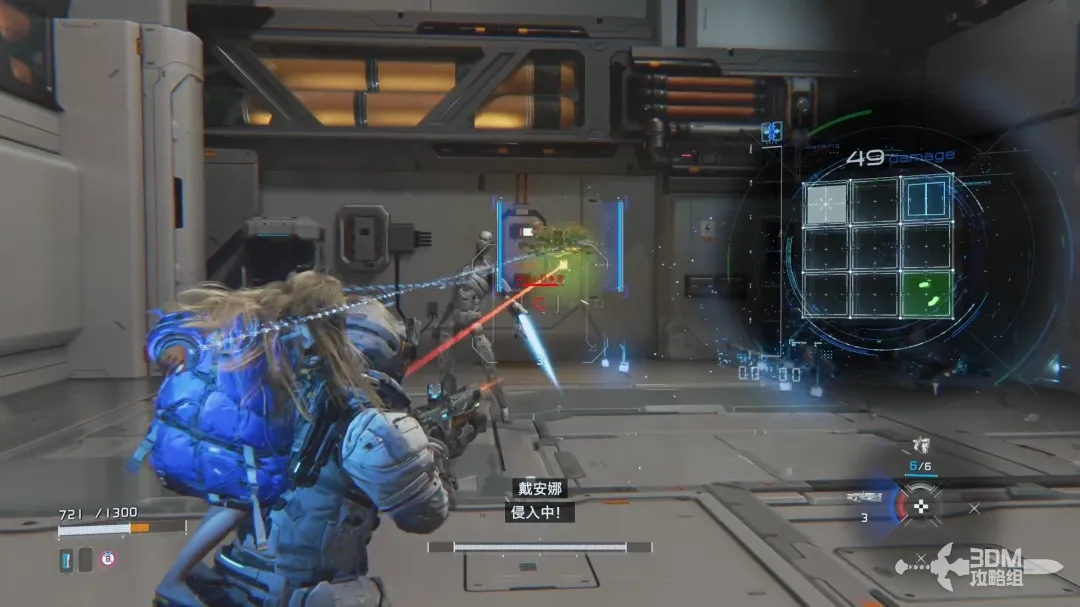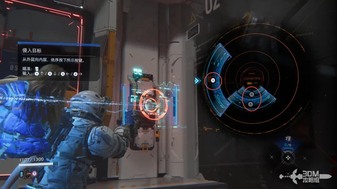 左扳机瞄准的时候屏幕右边会出现新的HUD,用手柄上的按钮控制矩阵内的侵入条走向;当连接到绿色的节点时敌人会被破解,此时可以造成可观的伤害。