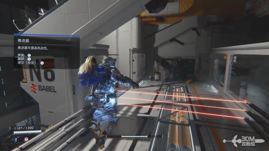 朝右走,按住A悬浮,跳过两道激光。