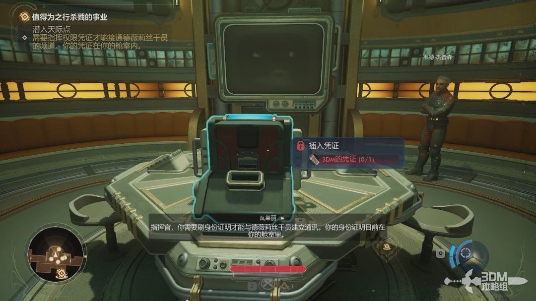 我们跟着目标点走,先来到下方的机器处,和机器互动可以接取到主线任务值得为之行杀戮的事业。此时我们没有获得凭证,并不能启动。