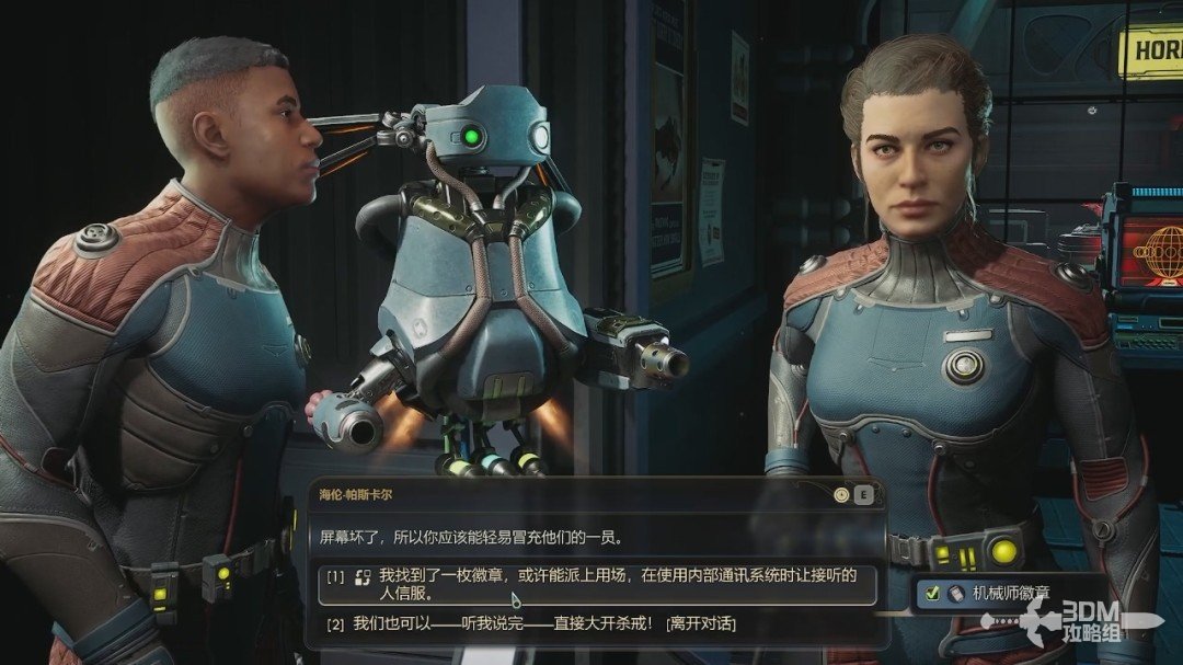 我们去楼下会自动触发对话,在对话的时候出现这个选项的时候选择第一个(需要刚才捡到的机械师徽章)。
