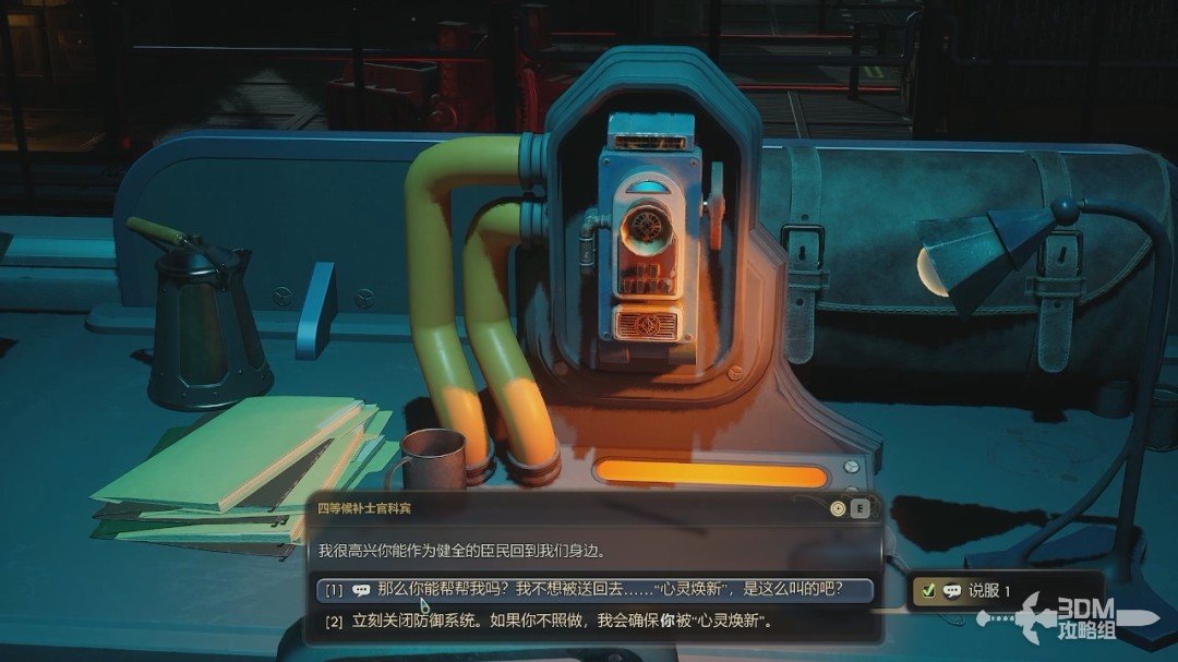 后面的对话可以用到“说服1”来说服他,他会帮我们关闭防御系统。这样外面的机器就不会攻击我们。