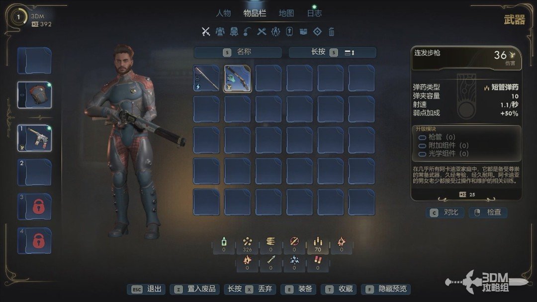 技能点完后我们就可以行动了。如果是豪华版的话我们还会额外获得几个装备,可以在装备栏里装上。