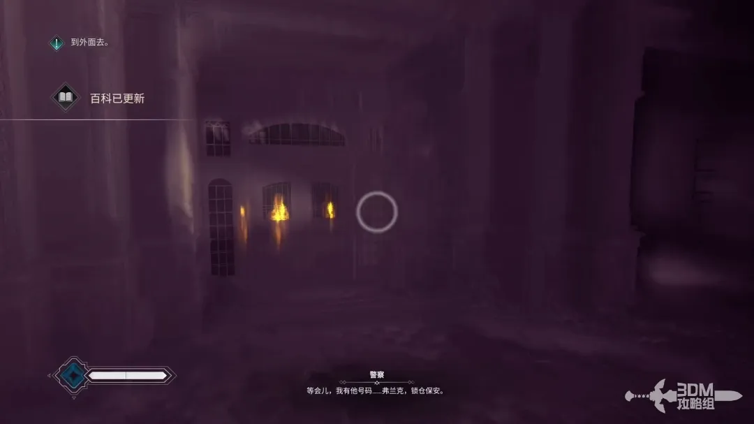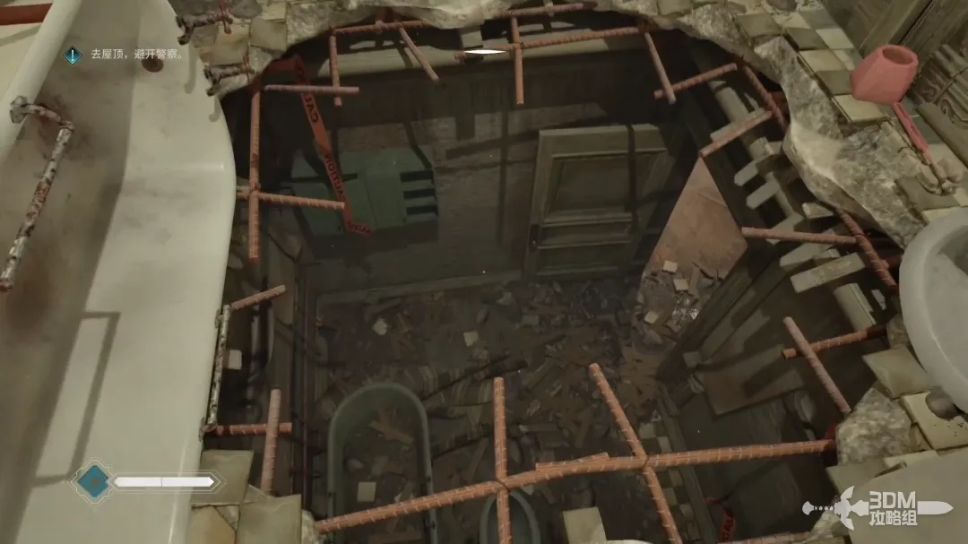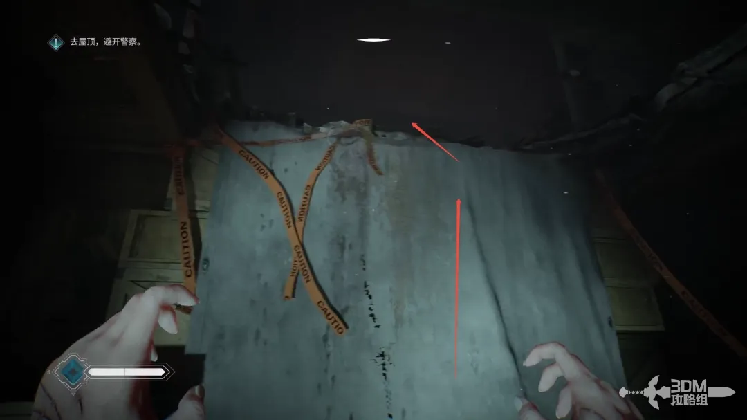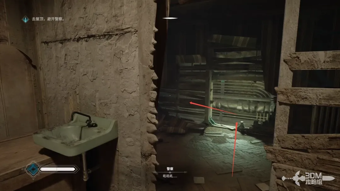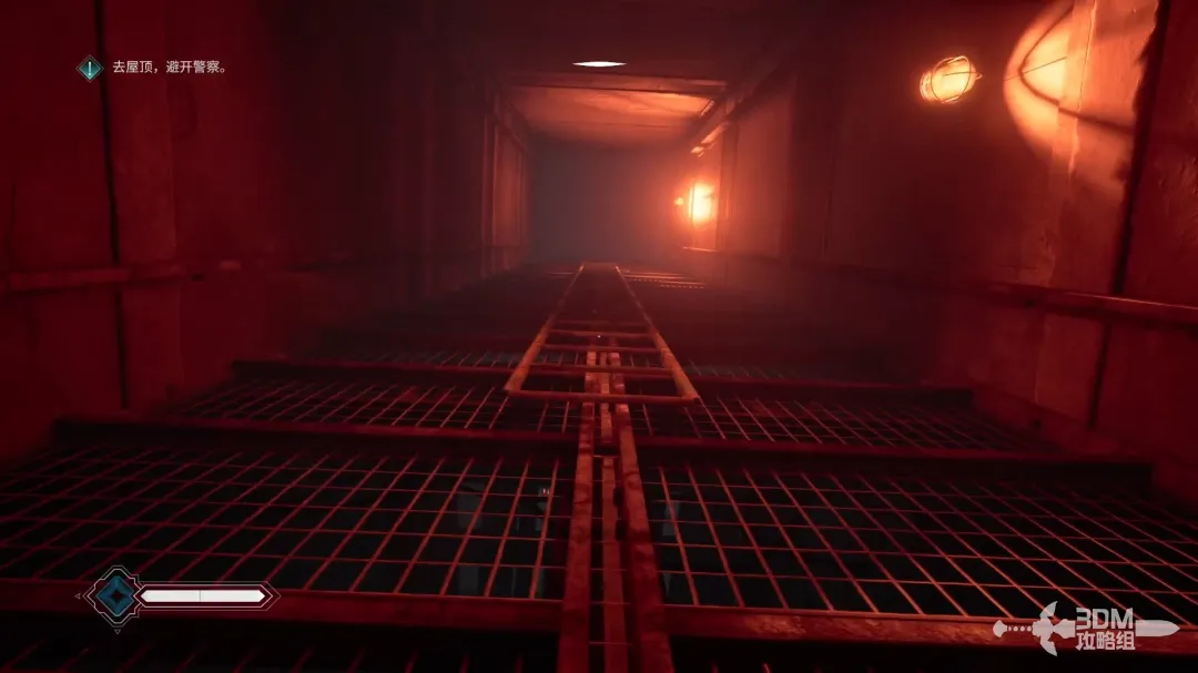 这一层也有警察巡逻,按C键蹲伏,从旁边的暗道里走。