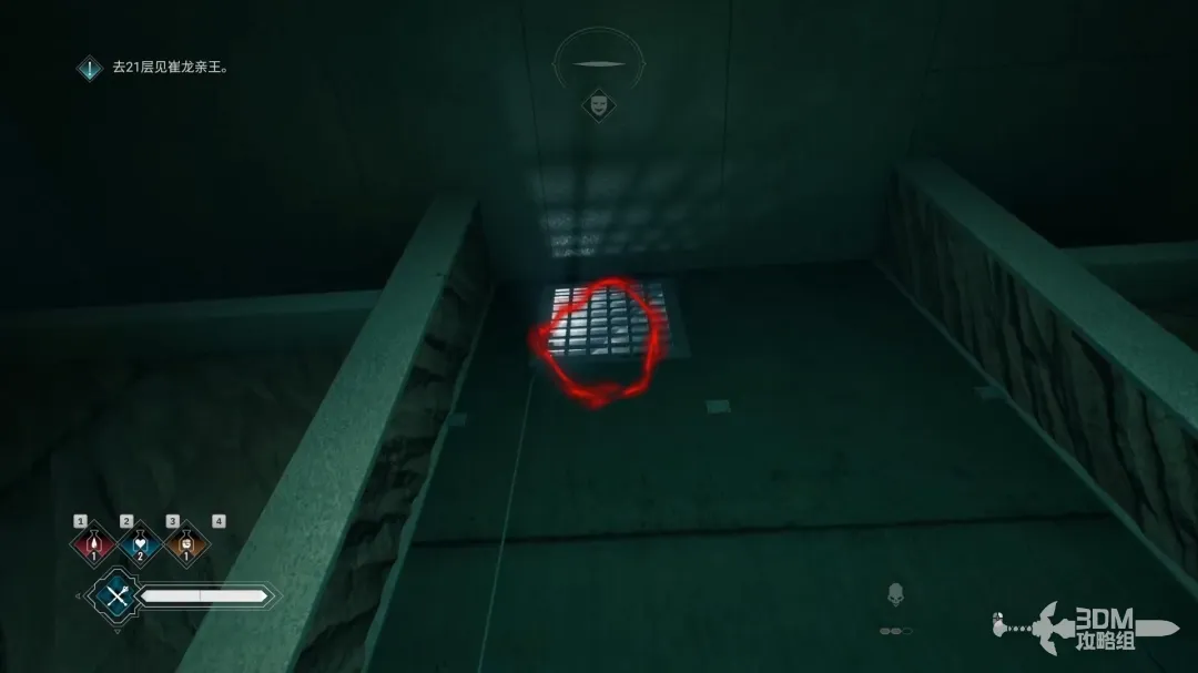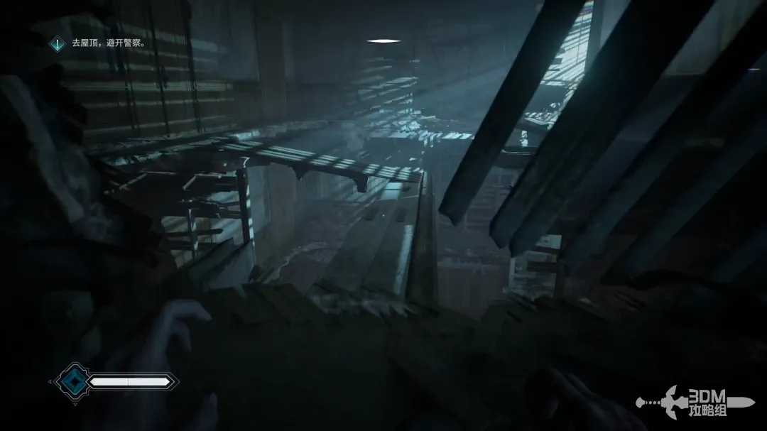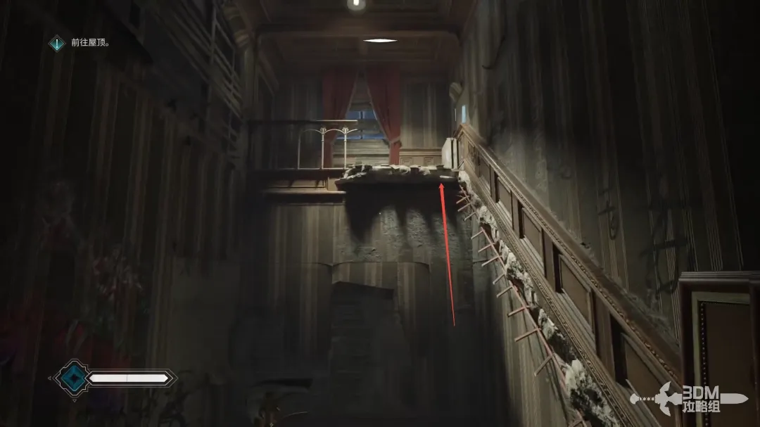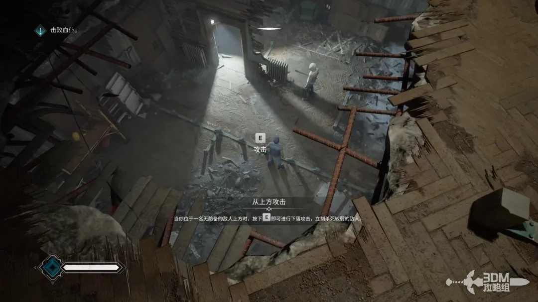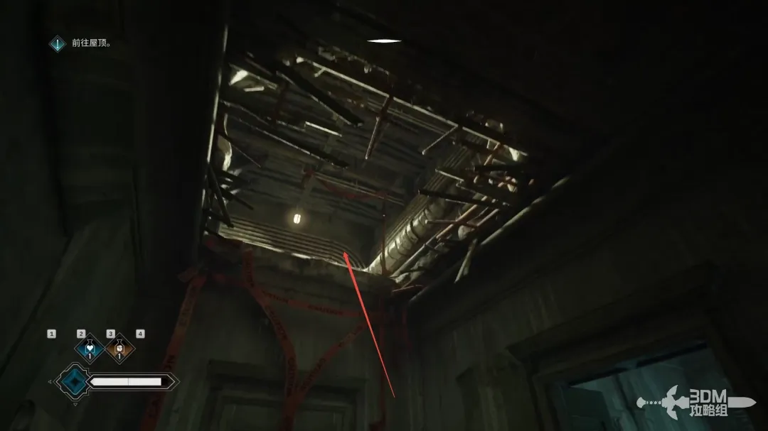 击败所有敌人后,抬头按Q破坏天花板上的木板。