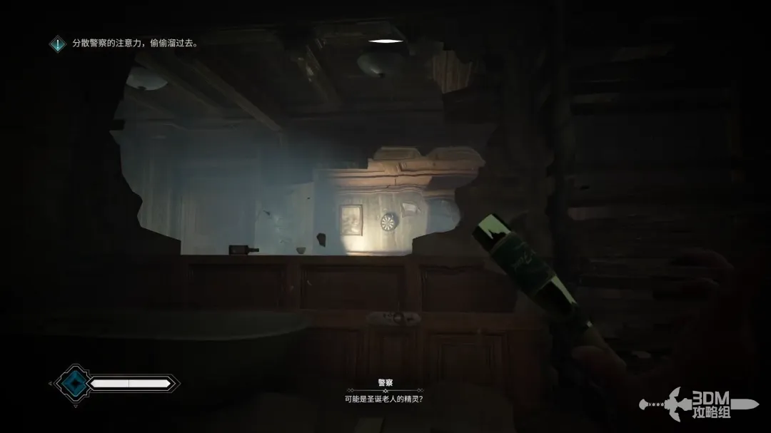 往前走有一个巡逻的警察,在地上随便找吸取一个物品扔向对面吸引注意力。