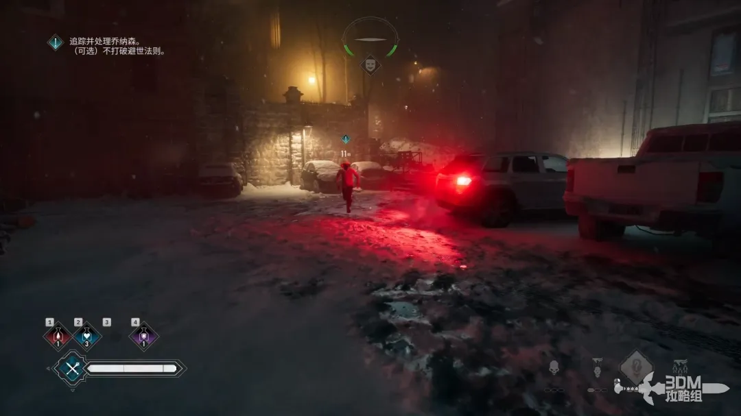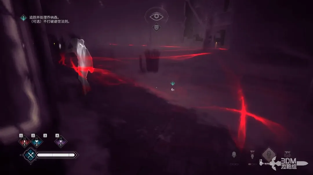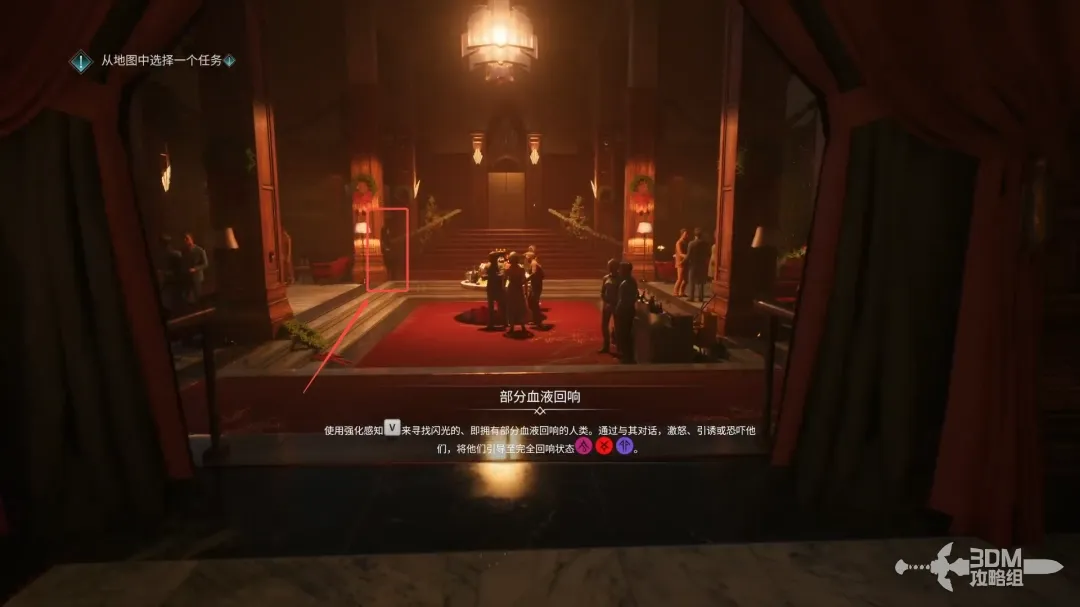 按V键打开 视觉强化技能,跟着红色的引导线往前走,在大街上时不要使用吸血鬼的任何技能。