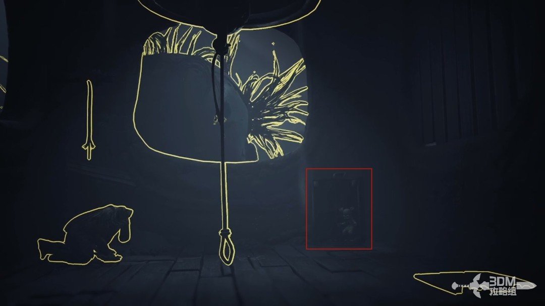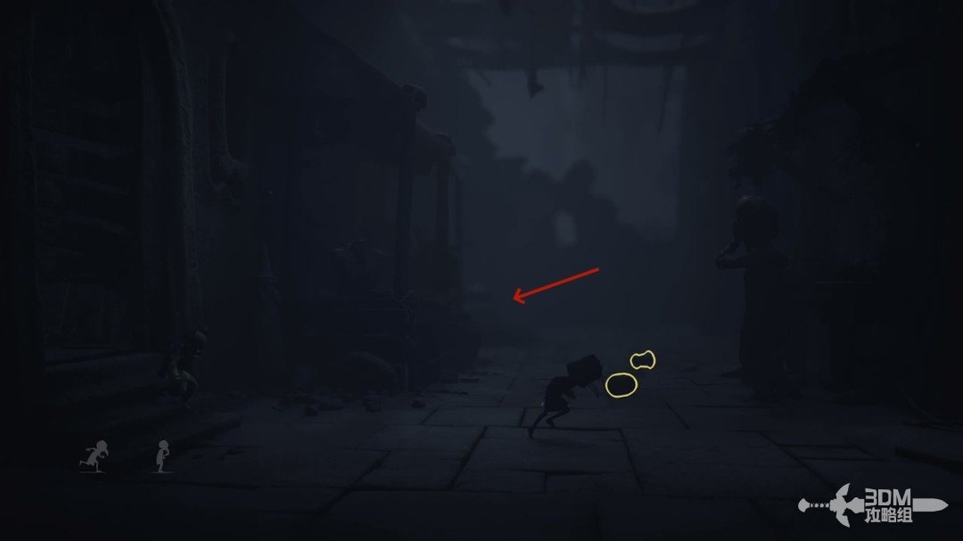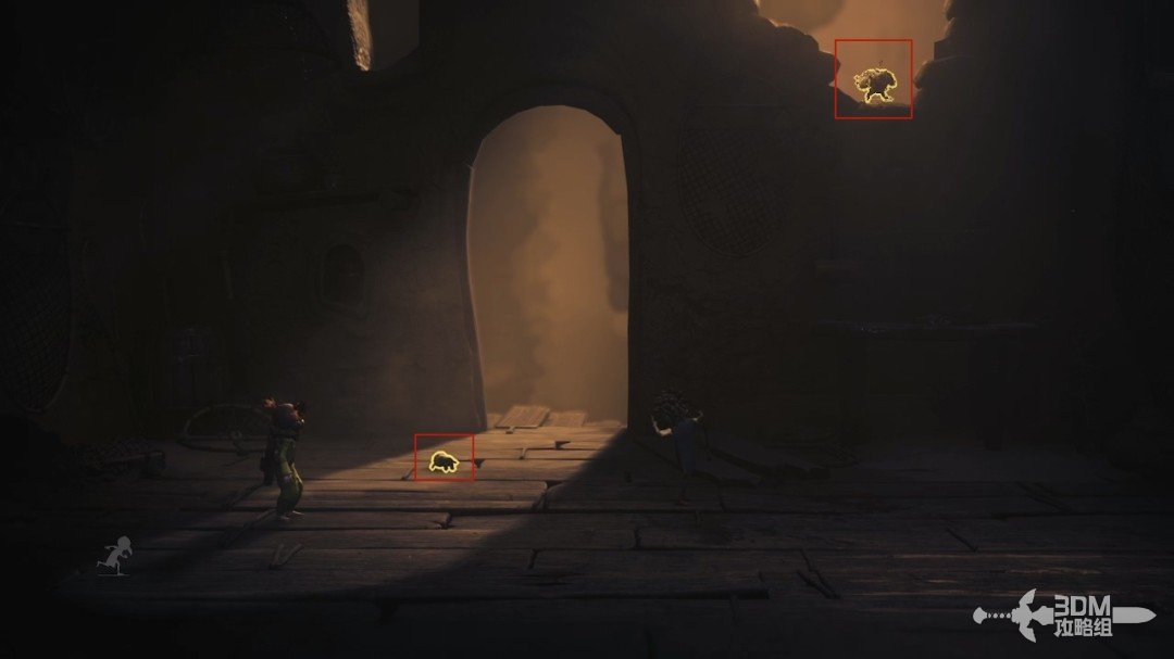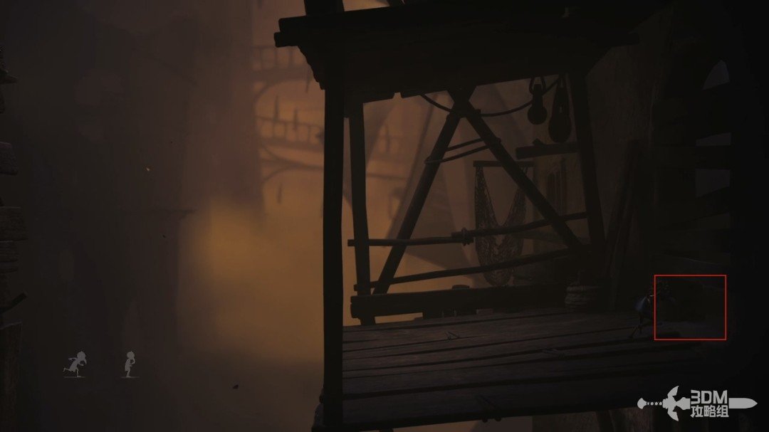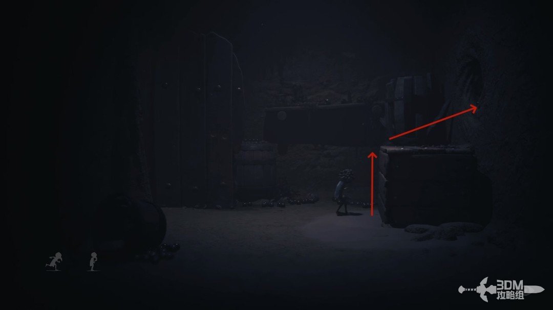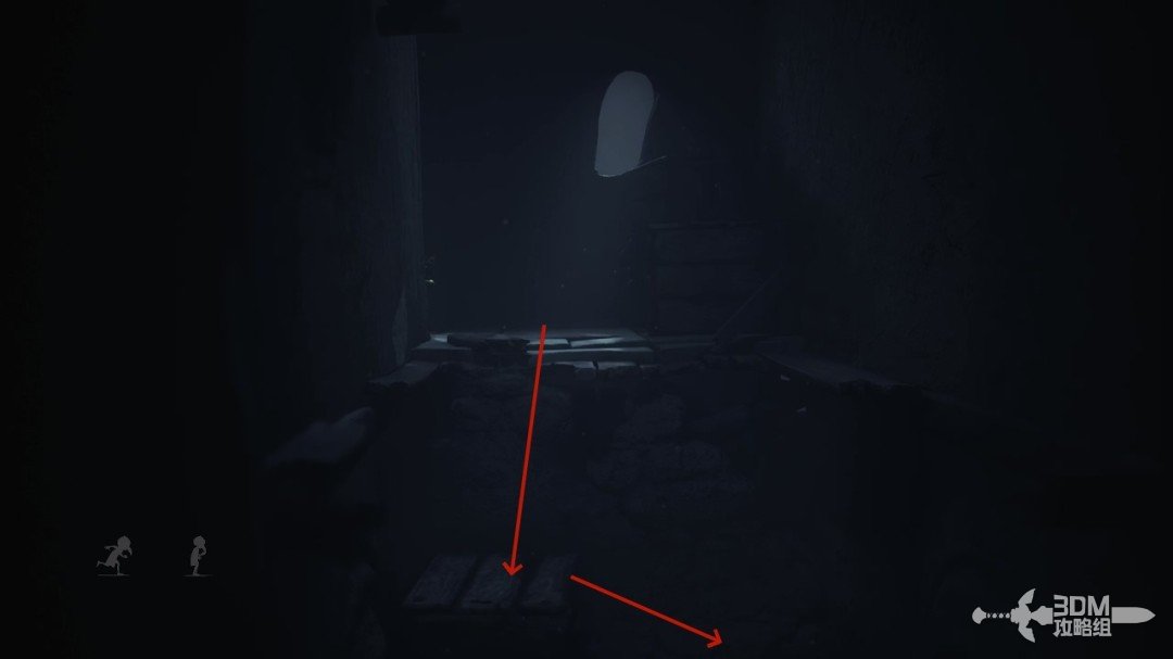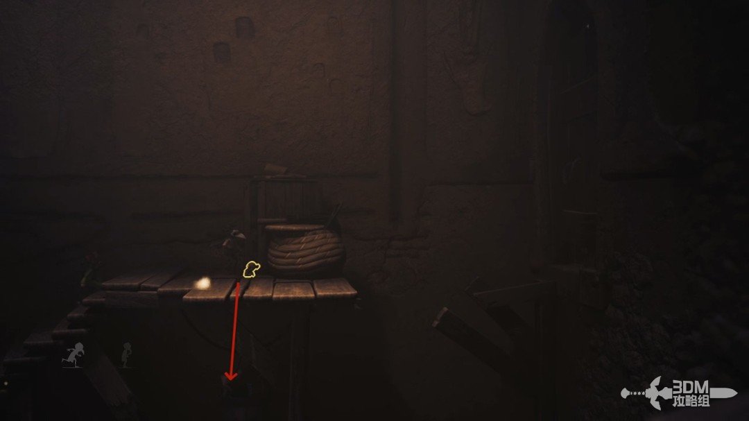 往右边掀开木板,来到图上这个位置,红色箭头处有一个娃娃过去拿一下。