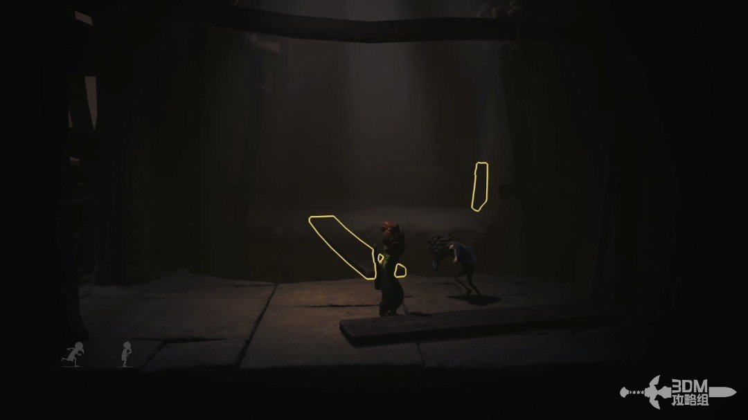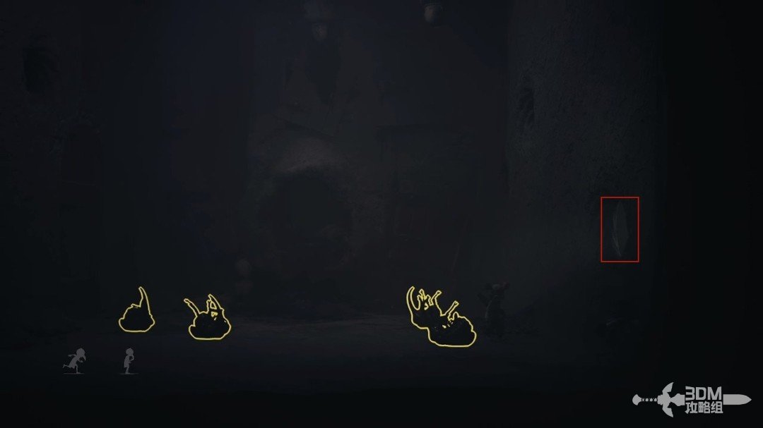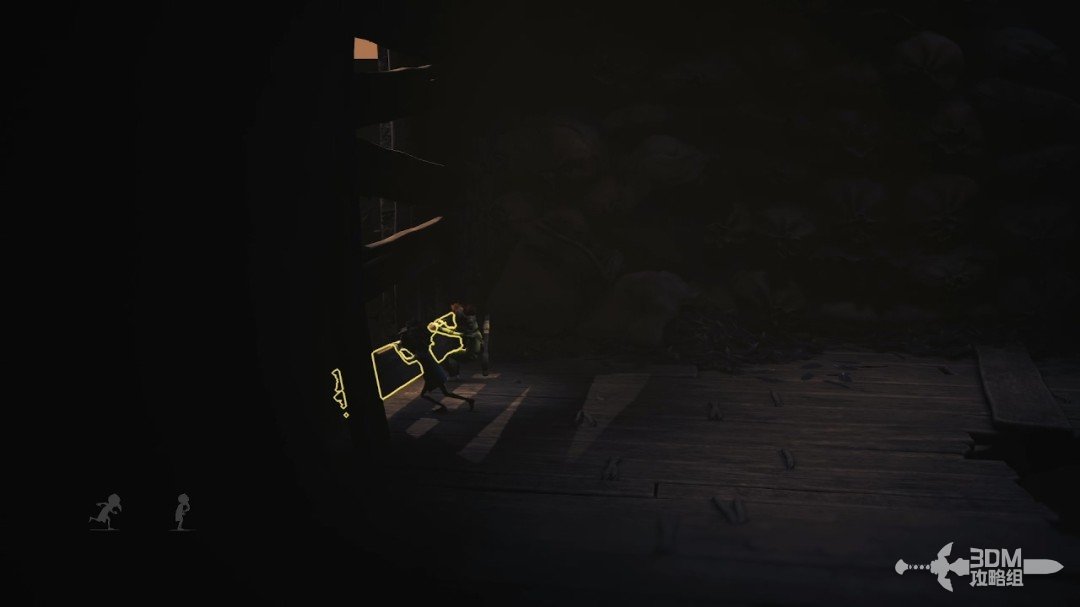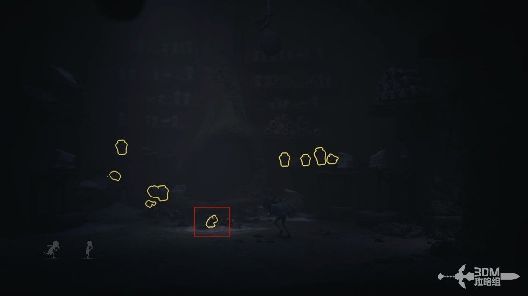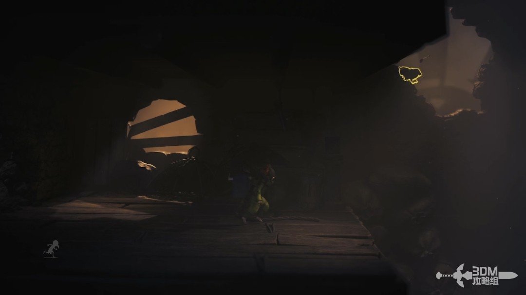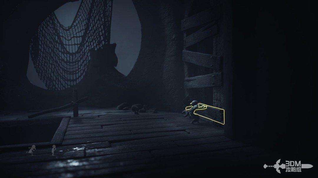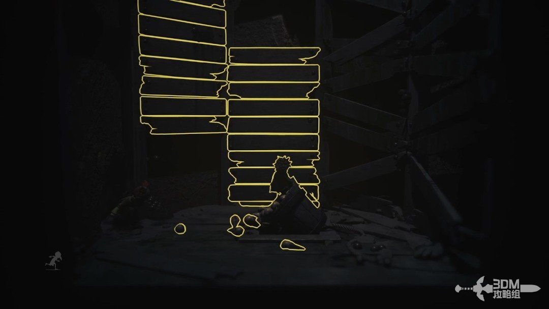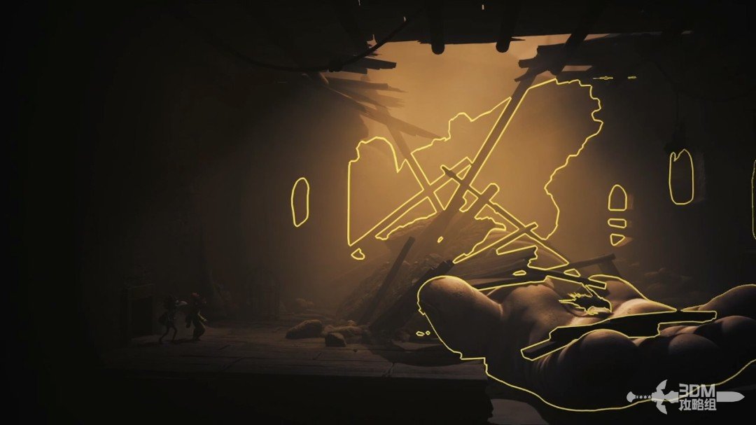 往右边掀开木板,来到图上这个位置,红色箭头处有一个娃娃过去拿一下。