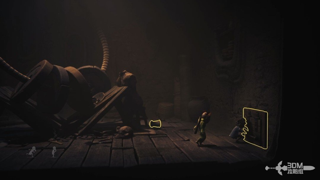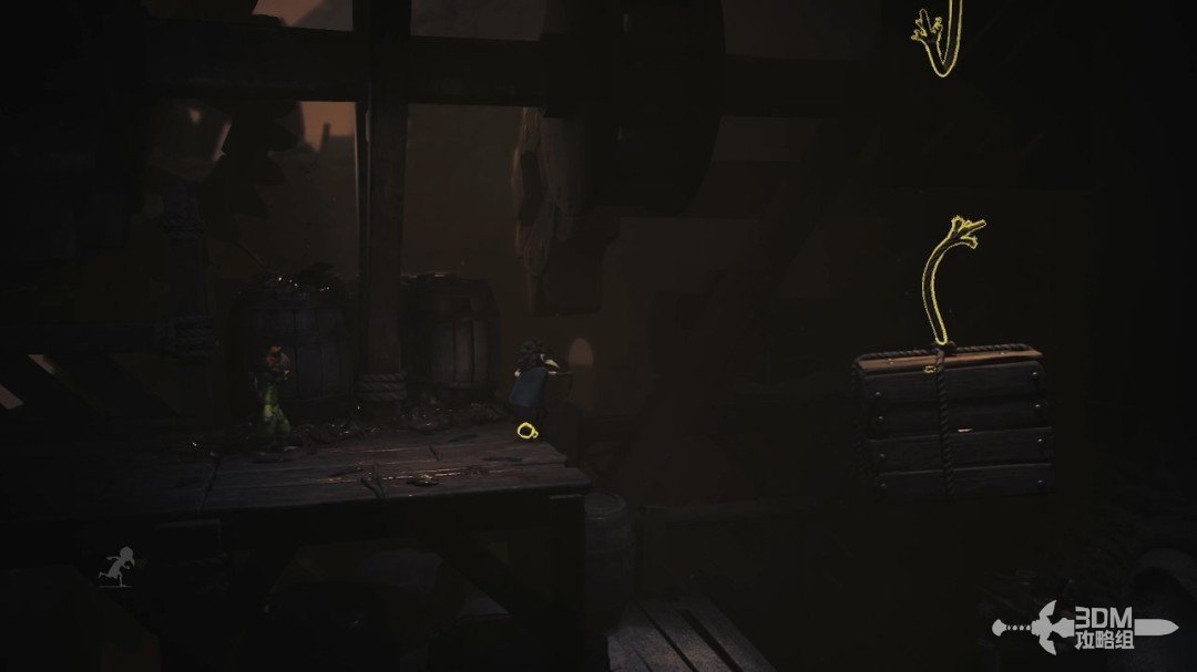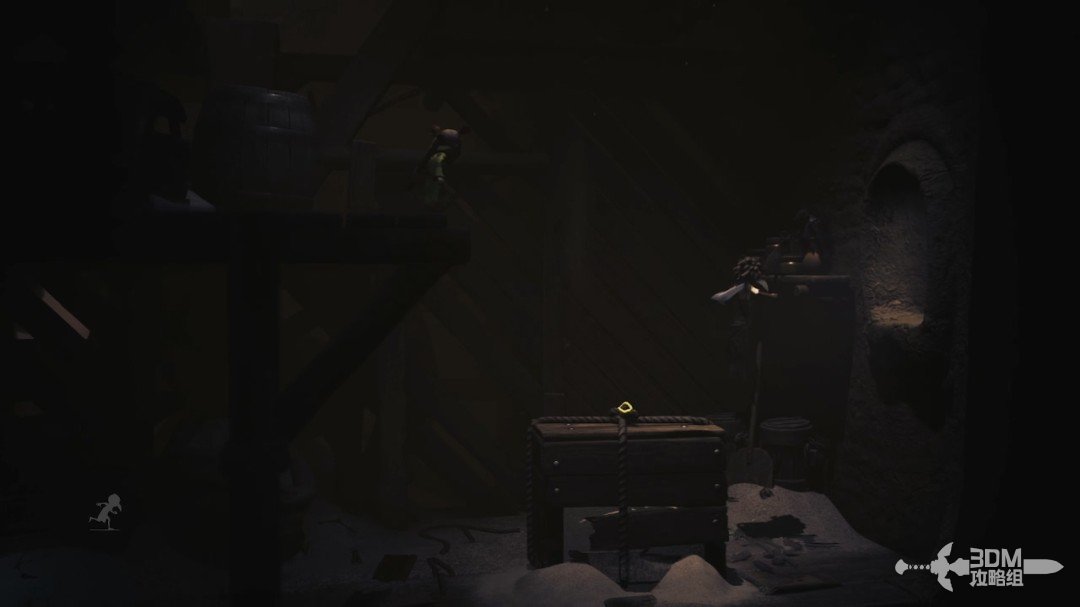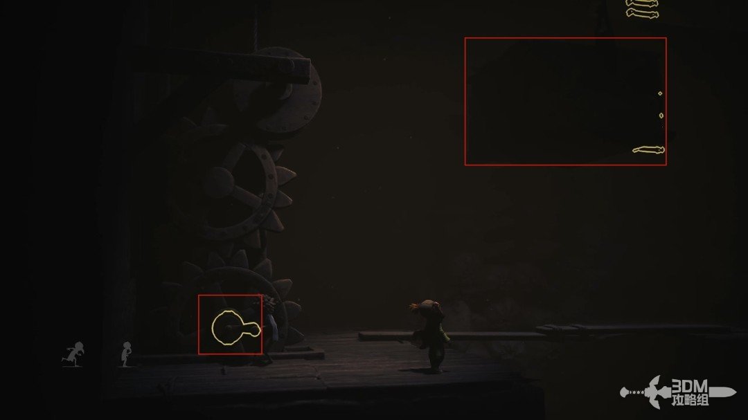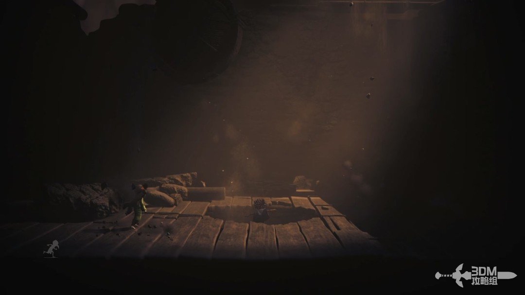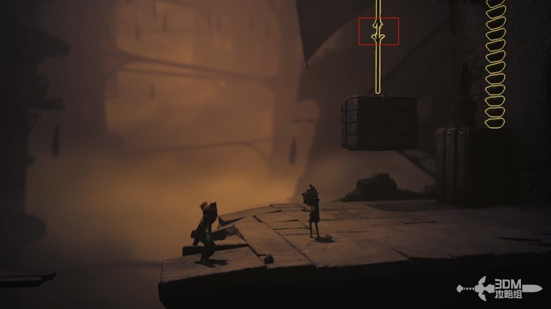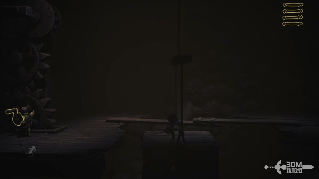 我们先踩中间的木桥来到左边,来这边转动机关控制一下中间的箱子高度(很黑,有点看不清),这个机关可以360度旋转。
