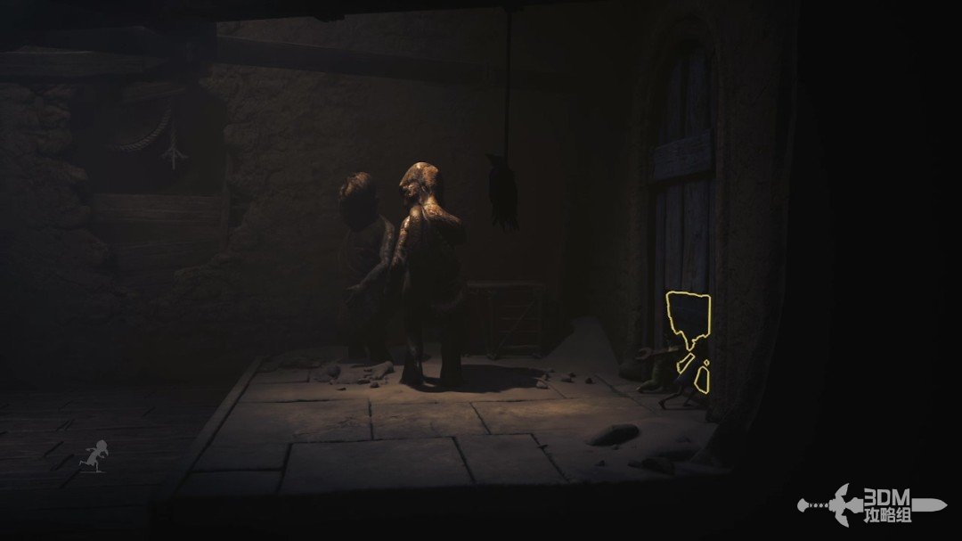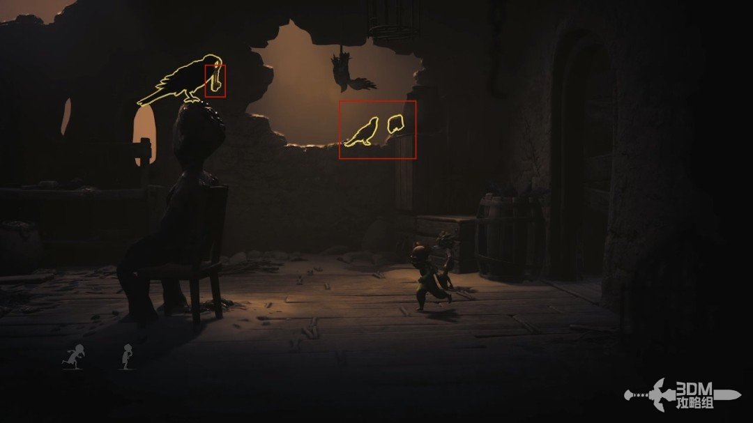 敲掉后来到隔壁房间,地上有一个娃娃,也是收集品。右上角的乌鸦可以用弓箭射击。