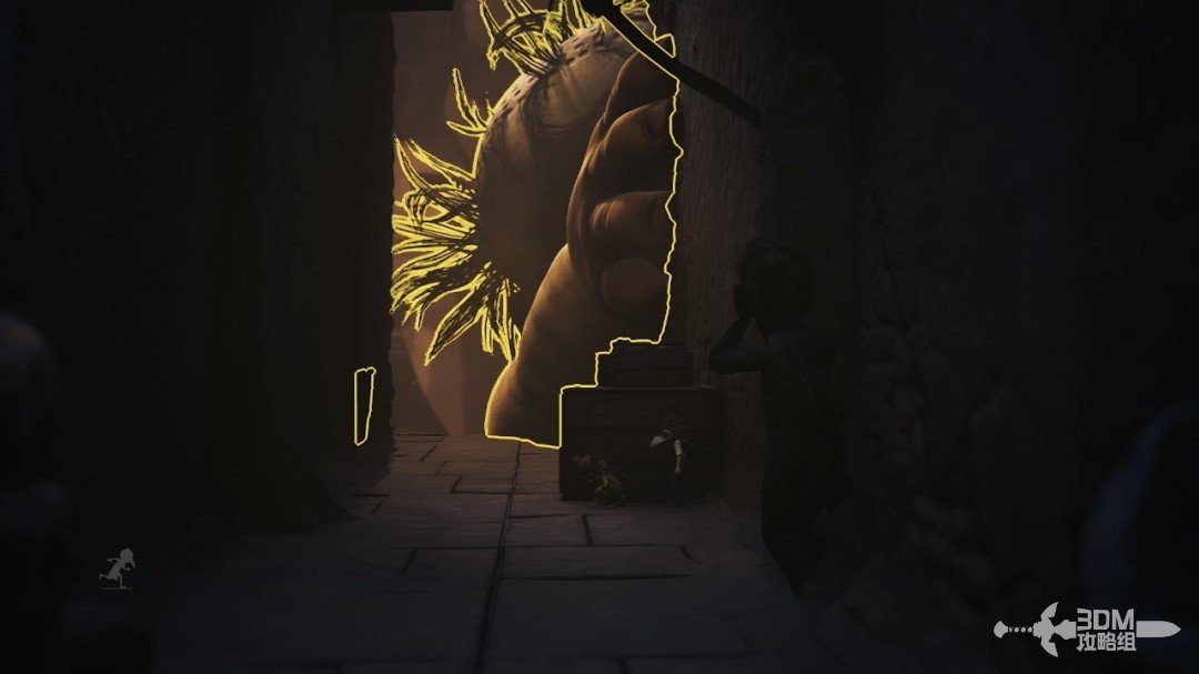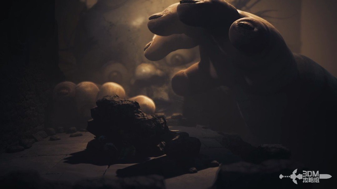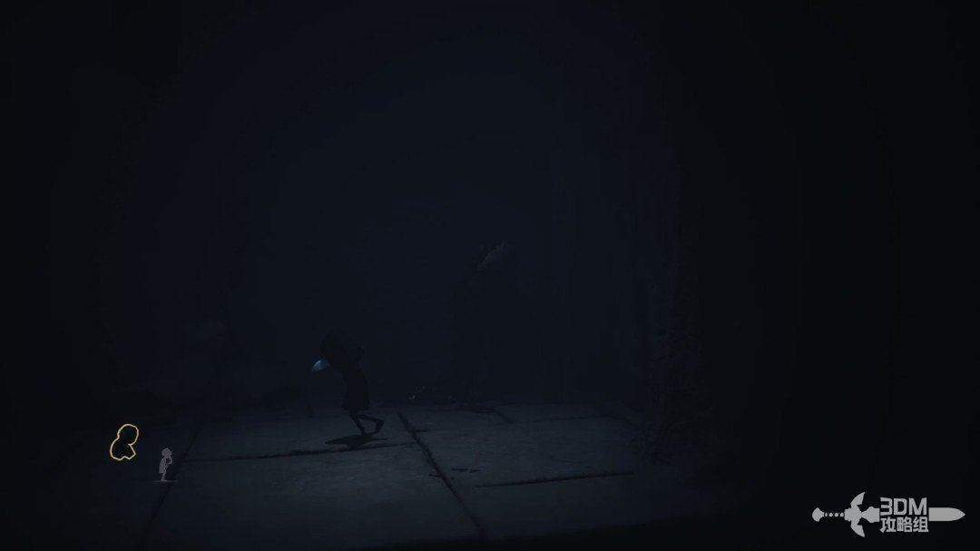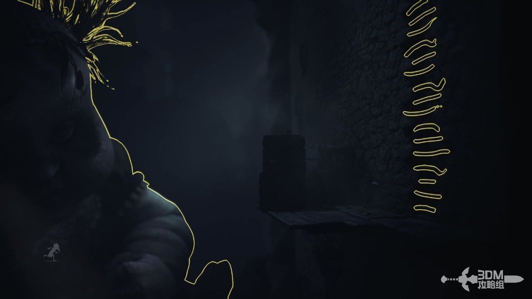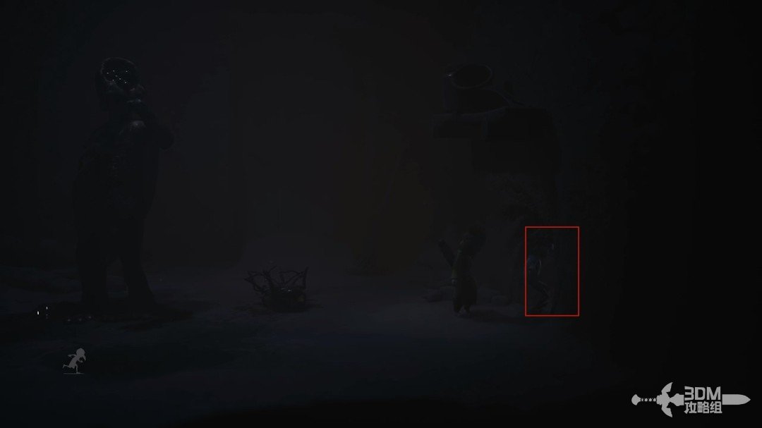 接下来走一段路来到一个房间,这里巨婴会再次出现。他会拿起中间的玩具(是玩具吗?),我们要从这个洞口跳下去。