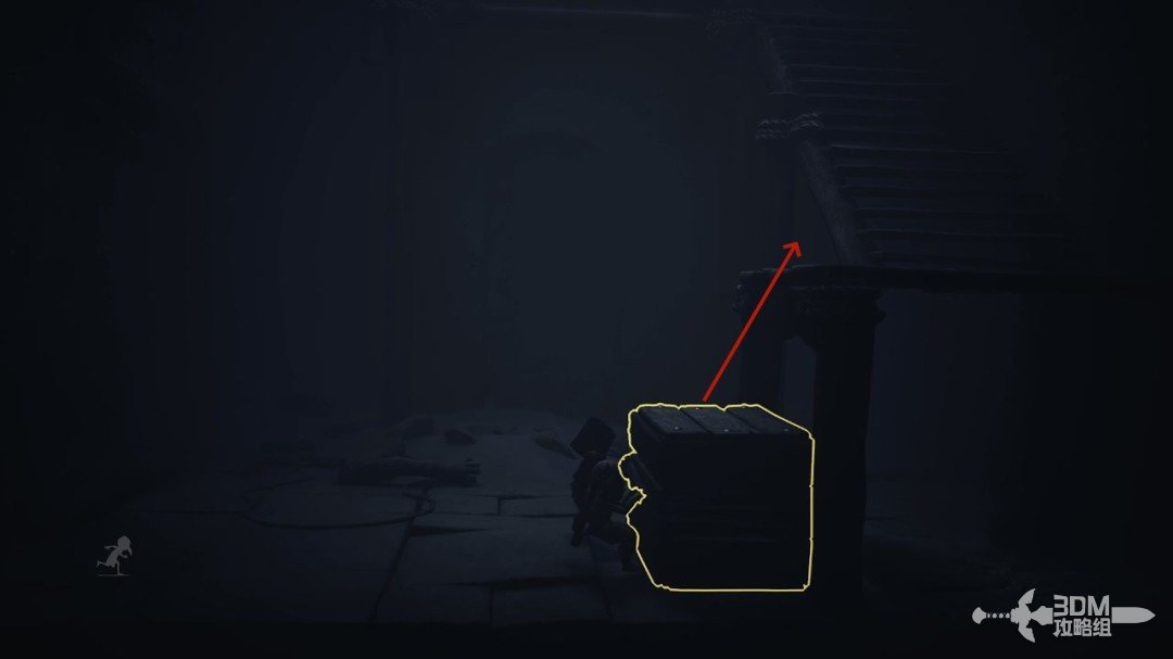 来到右边,合力把箱子拉出来,踩箱子跳上去。