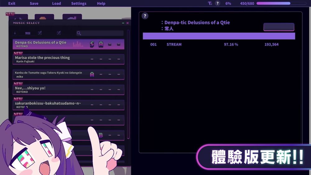 在试玩版中,玩家可体验游戏开场部分约 30 分钟,节奏游戏与冒险场景的循环内容。虽然剧情不会推进,但在通关试玩版后仍可继续游玩节奏游戏。此外,在计划收录的乐曲中,试玩版已包含隐藏曲在内超过 10 首乐曲。