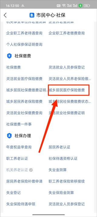 进入社保后,找到社保缴费模块,然后选择【城乡居民医疗保险缴费】