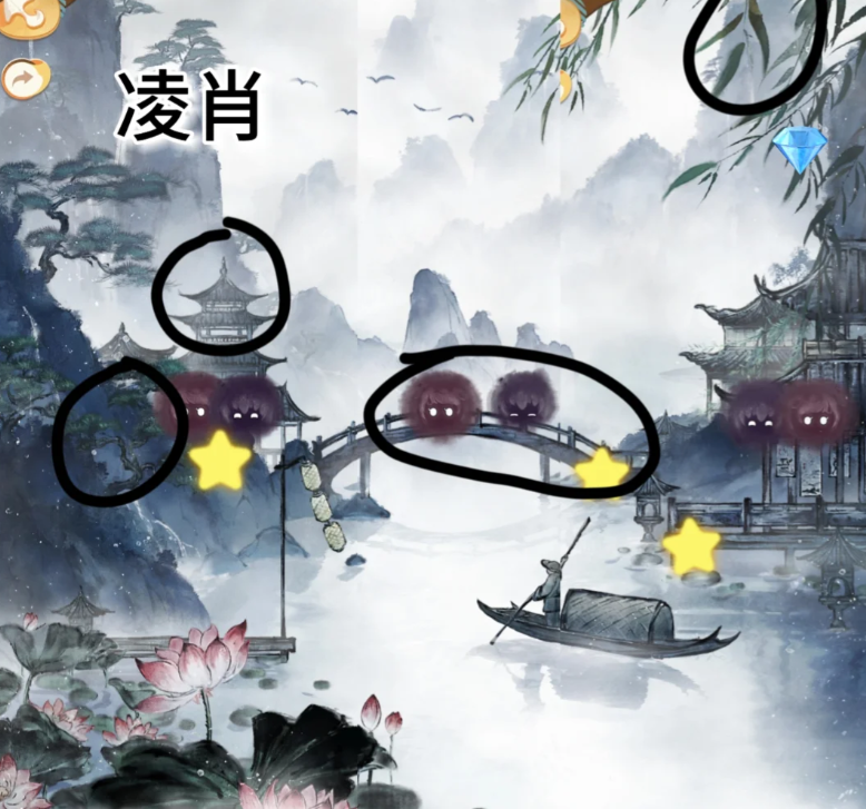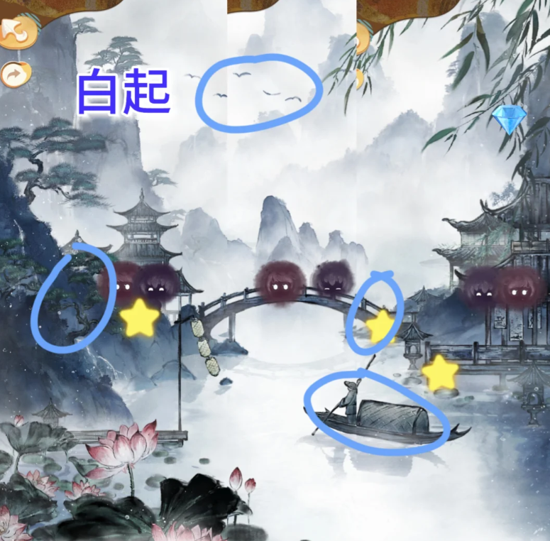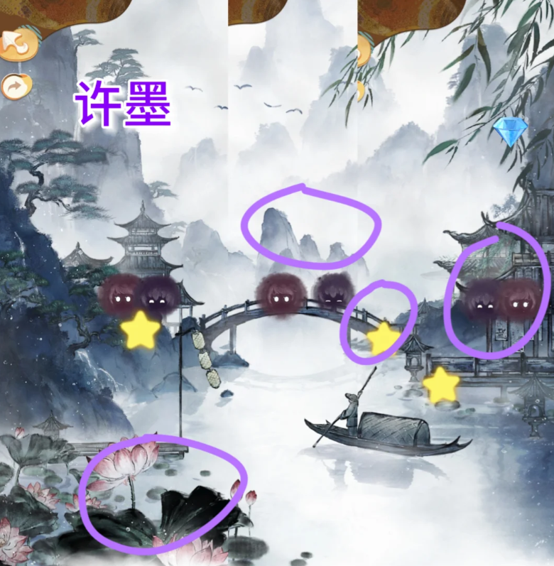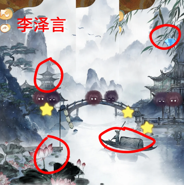 恋与制作人八周年活动的水墨画探索中,初见世界中完成其中一个人的之后,其他人的可以直接点击跳过,但人需要走到三个星星标注的位置,点击入画。许墨探索的是荷花,桥,小山,亭子;李泽言探索的是柳条,荷花,乌篷船,亭榭;白起探索的是鸟,松树,桥,乌篷船;周棋洛探索的是小山,乌篷船,荷花,旗杆;凌肖探索的是柳条,亭榭,松树,桥。