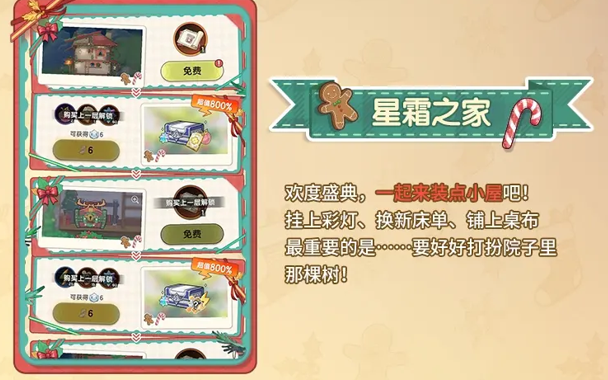 3、星霜之家:欢度盛典,一起来装点小屋,挂上彩灯、换新床单、铺上桌布最重要的是……要好好打扮院子里那棵树。