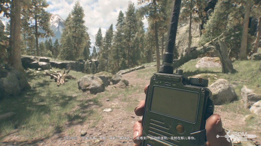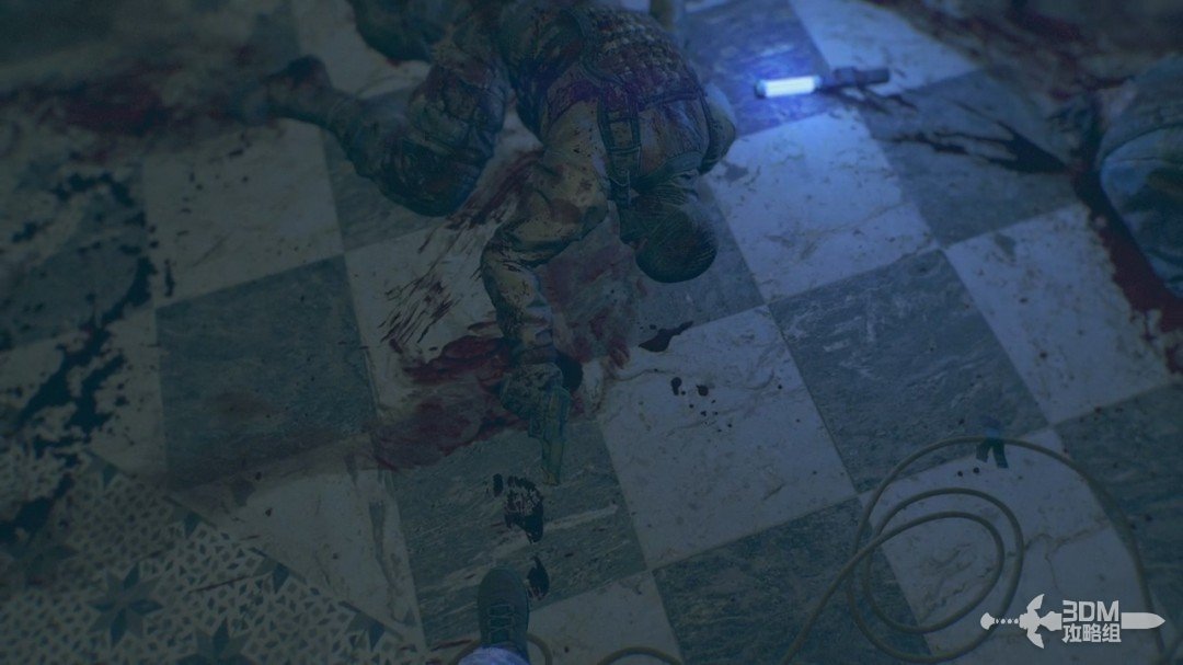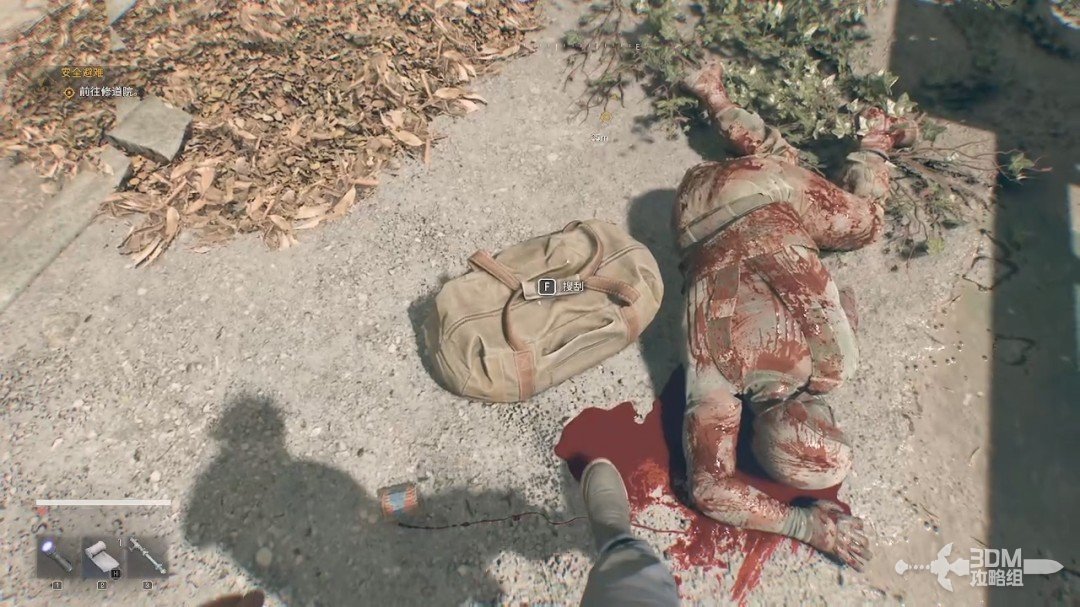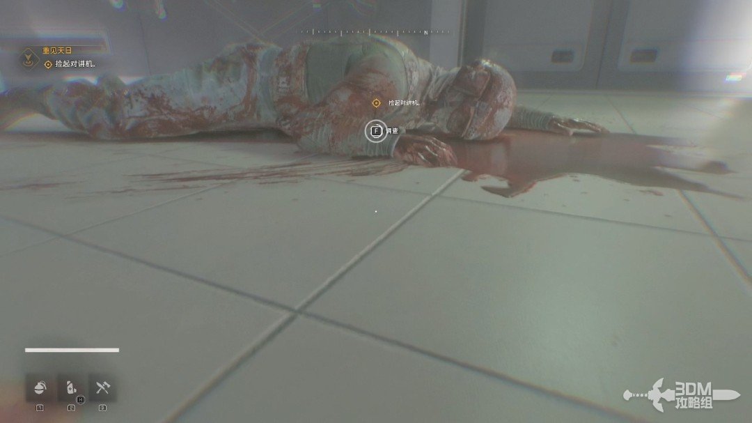 随后我们又被对讲机里面的女声叫醒,这时候可以开始操作了,我们爬到前面的尸体旁边,长按F拿上对讲机(设置里可以改长按或者点按QTE,长按比较方便)。
