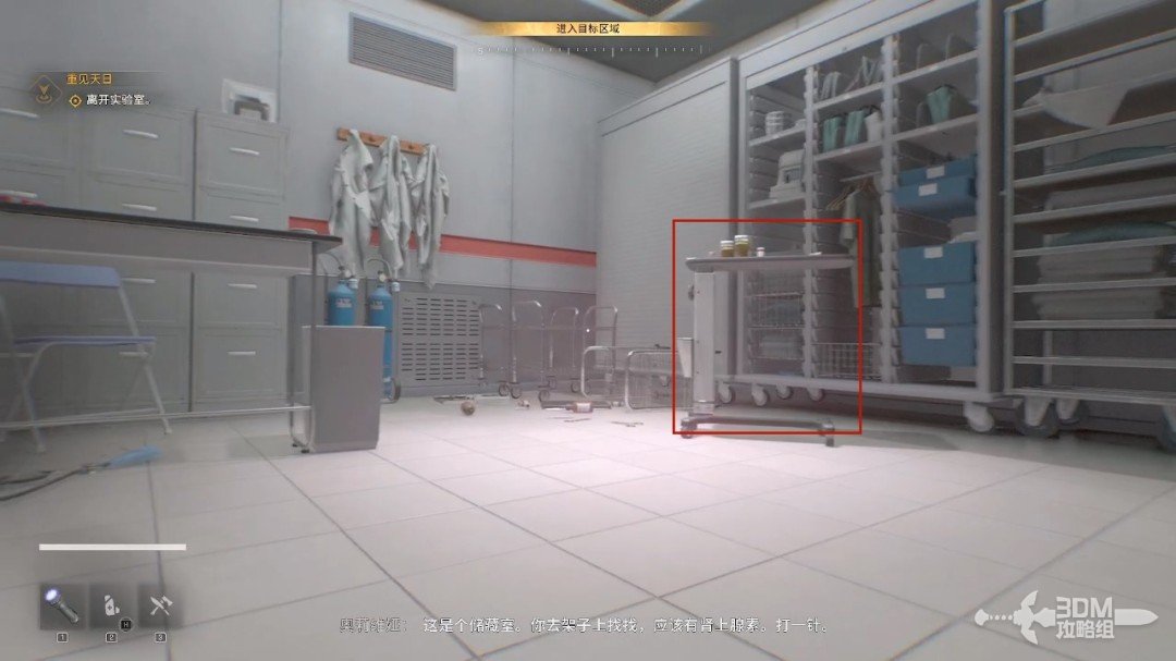 从通风管道出来,我们一直跟着目标点走,爬到这个房间,靠近这个架子可以获得肾上腺素。