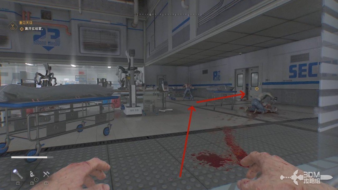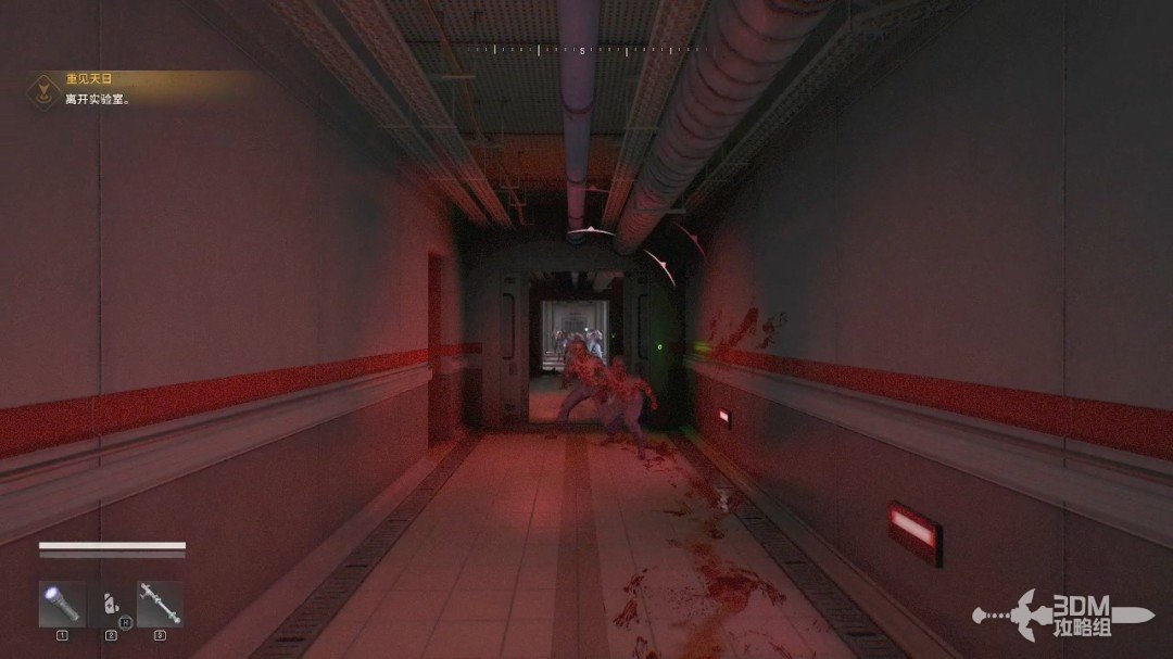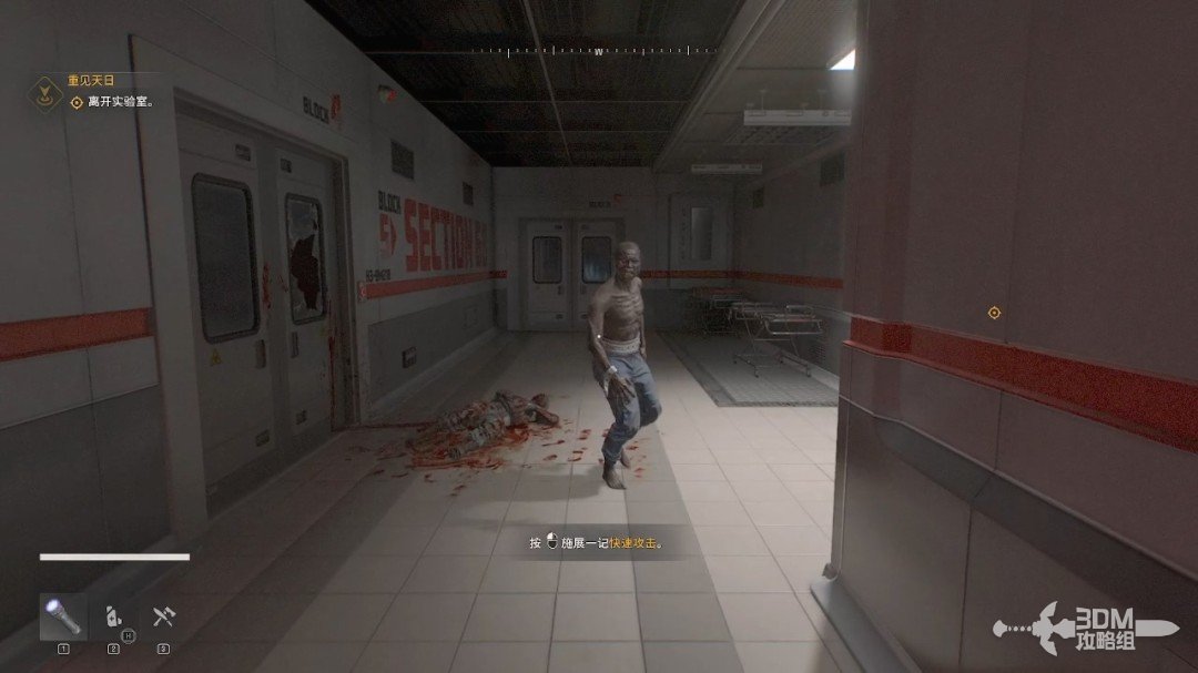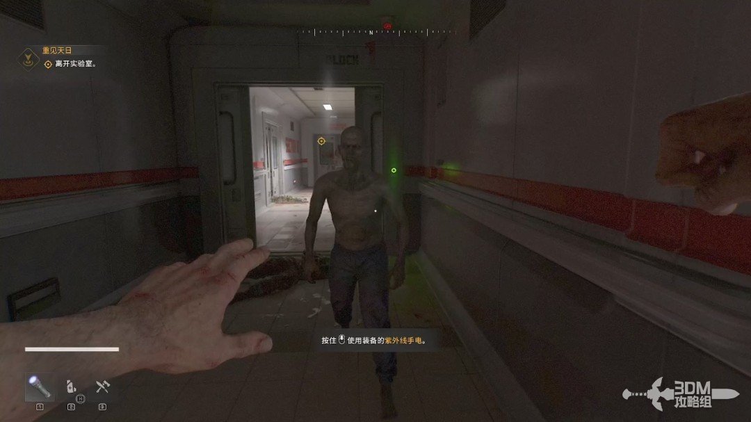 这一代的丧尸还是害怕紫光。我们可以看到左下角的1号键就是紫外线手电(图标显示什么就是什么道具,不需要再次切出来),可以按鼠标的滑轮键使用。