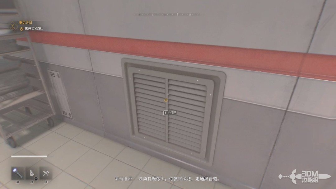 拿到对讲机后,对讲机里的人说自己叫奥莉维娅,她会帮助我们逃出去。我们先爬到前方的通风口。