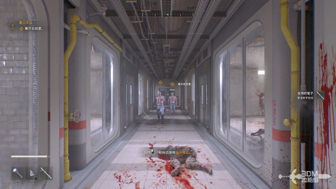 顺利潜行过来,我们要路过停尸房,这里全是丧尸,我们会拿旁边的水管当武器。现在可以长按鼠标左键打强力攻击。