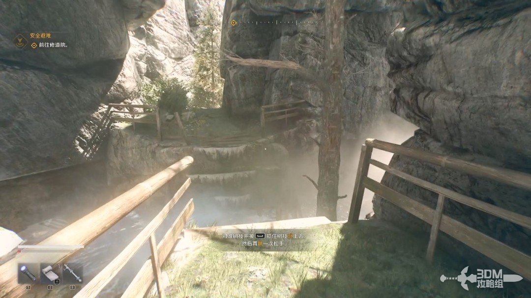 攀爬的时候会出现提示。在我们悬挂的时候可以通过鼠标移动视角方向转向,按下空格键跳跃到另一个边缘。