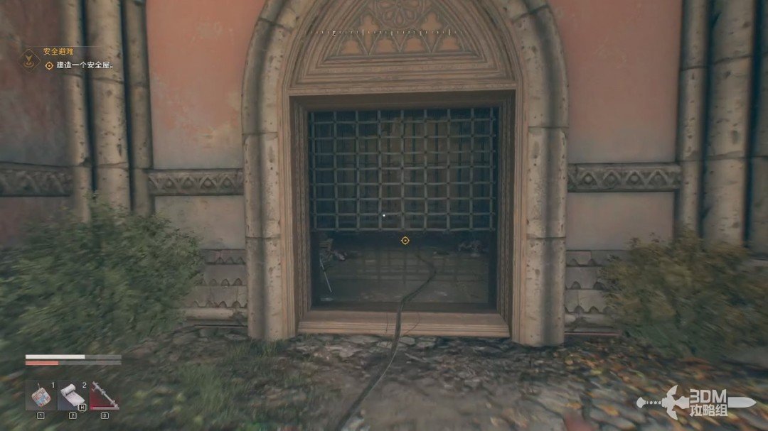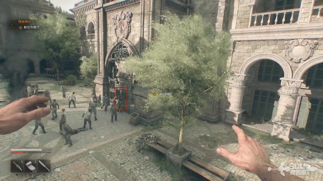 跟着目标点来到市政厅的外面,我们可以从这个门缝钻进去或者爬进去,不过门口有很多丧尸,可以在旁边跑一圈吸引开。