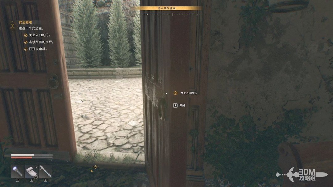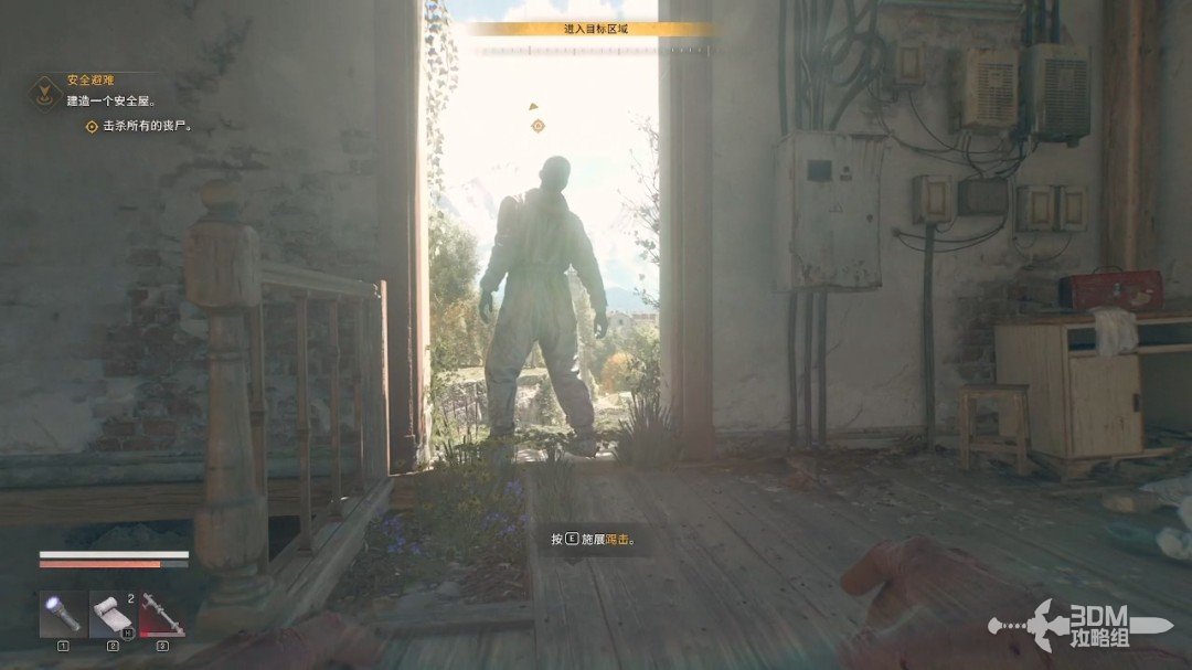 走到目标点门口,系统会提示我们使用噪声诱饵吸引丧尸的注意力。按数字1可以切换到诱饵,长按短按都可以。