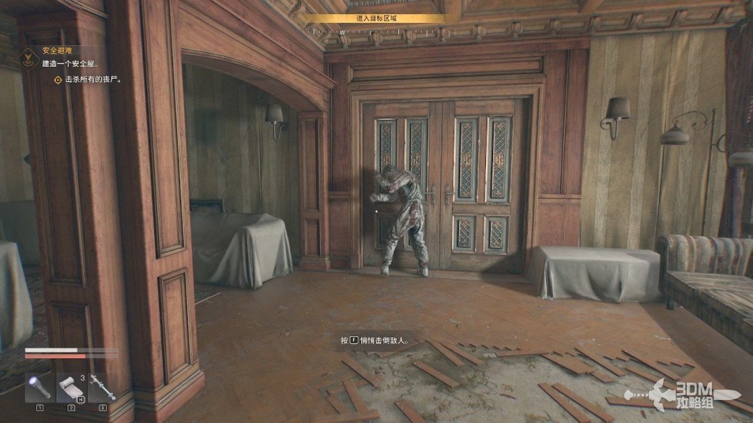 打死这个丧尸后往右边的门走,这个门需要我们长按F键掰开。
