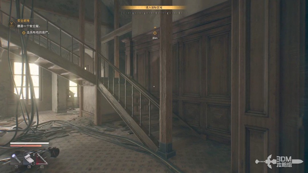 打开发电机后我们上楼。楼上一个背对我们的丧尸可以从背后偷偷击杀,不过实战用起来感觉不是很好用,丧尸很容易察觉到我们。
