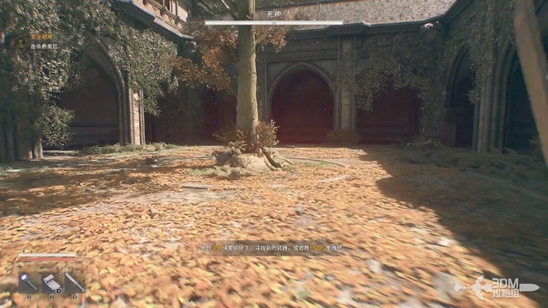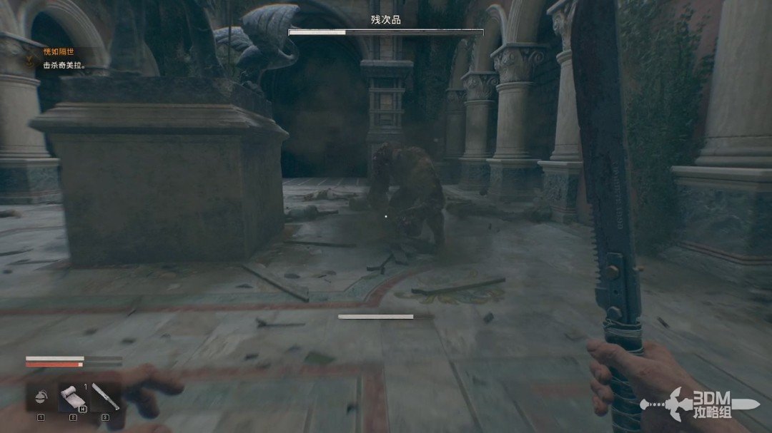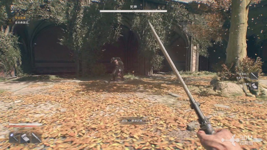 谈话结束后她会给我们一把武器,而附近刚好有奇美拉杀了过来,我们下楼和它对战。在战斗的时候可以按3号键切换使用的武器,左键就可以使用。