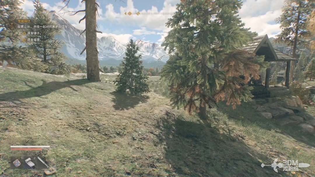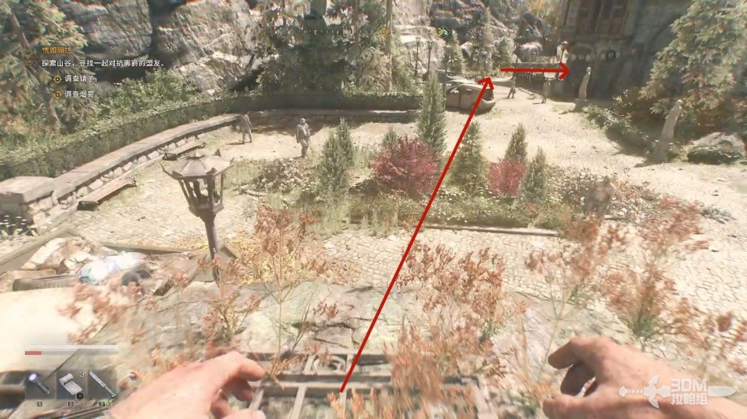 我们跟着目标点走,前面会有一个岔路口,左边可以搜集物资,不过是条死路,主路在右边。