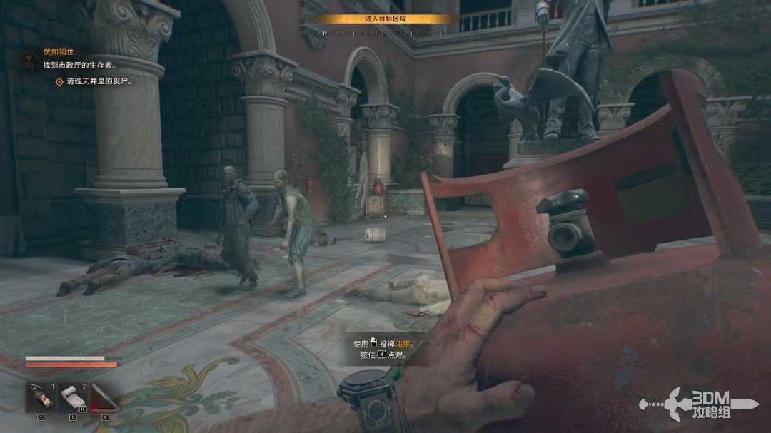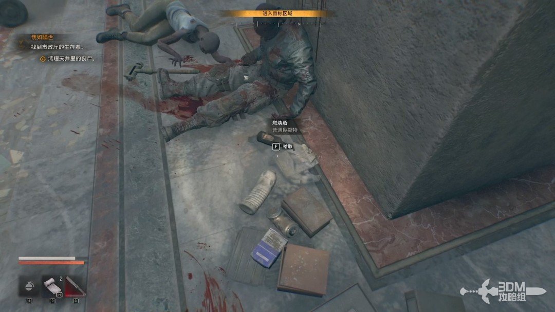 我们沿着目标点一直走,来到市政厅的天井处。这边有很多丧尸,我们可以拿地上的燃烧瓶或者瓦罐来解决掉它们。