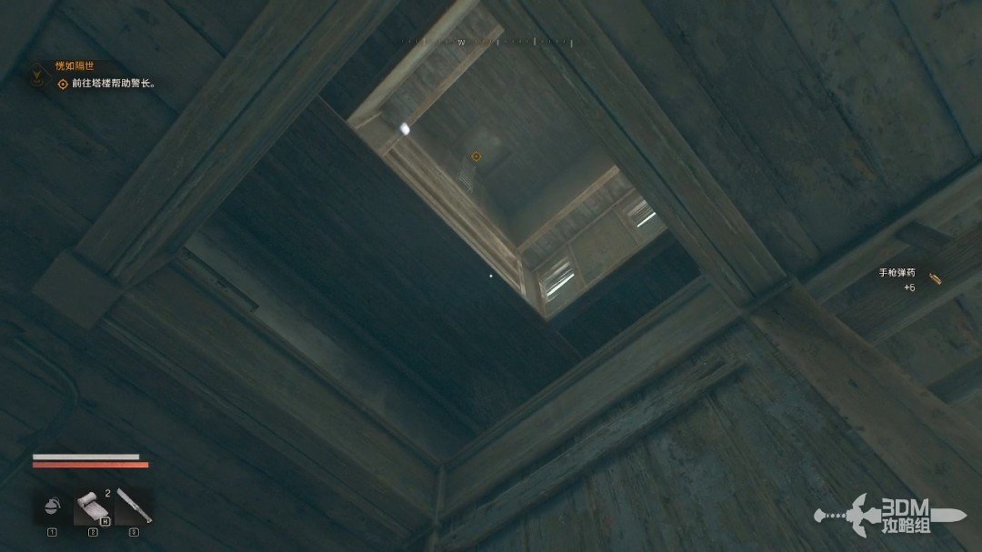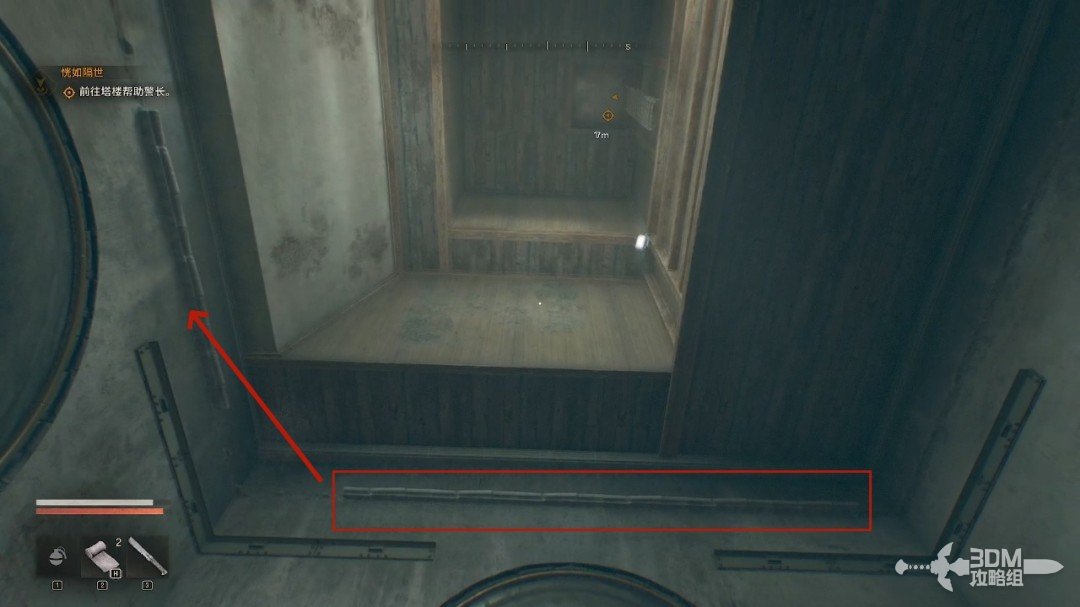 警长在塔楼上,我们在天井处往上看,沿着对面的建筑爬上去,直线爬即可。