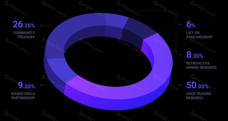 50% 用于流动性提供者和 10 年内的交易奖励结算26.2% 分配给社区金库9.5% 用于市场营销和合作伙伴关系8.3% 分配给自平台成立以来一直活跃并完成某些里程碑的用户3.5% 用于溯源挖旷奖励6% 用于在 PancakeSwap 上的上市
