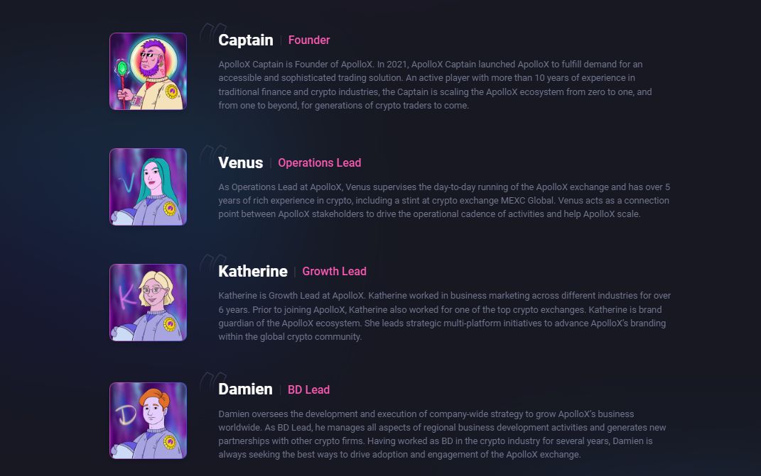 ApolloX Finance 于 2021 年推出,并在 2023 年更名为 APX Finance。它由一位匿名创始人(常称为“Captain”)创立,团队成员有 8 人,总部位于安提瓜和巴布达的安提瓜。该平台受多个可信风险投资公司和机构的支持,如 Binance Lab、3Commas、Kronos Research、LUX Capital、SafePal、LIF 和 TP,它们共同推动去中心化衍生品交易的发展。