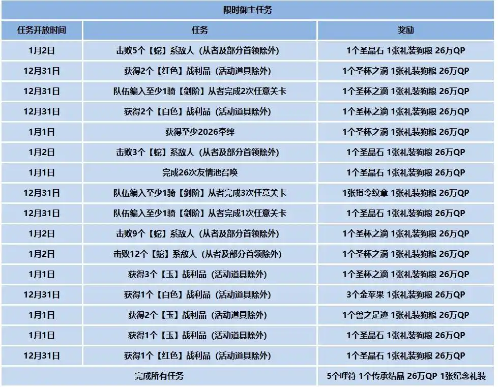 12月31日~1月31日期间开启限时御主任务,到奏章1为止的主线进度推进10次,可以获得15个圣晶石、50个五星狗粮、10个灵脉石、1组四星芙芙、1个梦火、1个传承结晶。