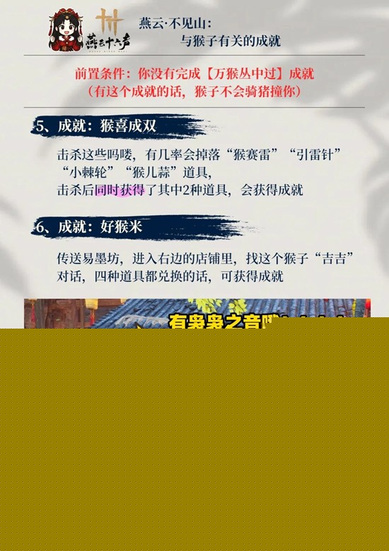 以上就是燕云十六声不见山成就攻略,猴子成就怎么获得攻略的全部内容了,更多游戏资讯,攻略内容敬请关注,您的支持是我们努力的动力!