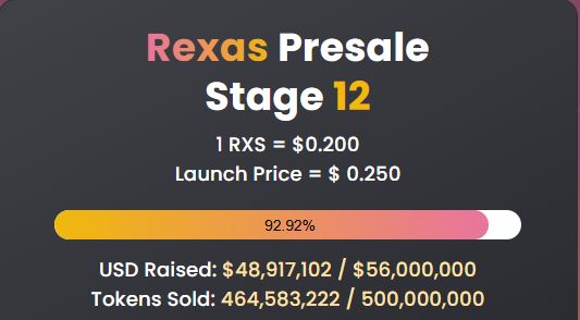 Rexas Finance 在加密货币领域引起了不小的轰动,其预售表现的提升预示着投资者态度的改善。在最新一轮融资中,该代币的价值为 0.20 美元,迄今为止已筹集到 48,917,102 美元,售出了 464,583,222 枚代币。