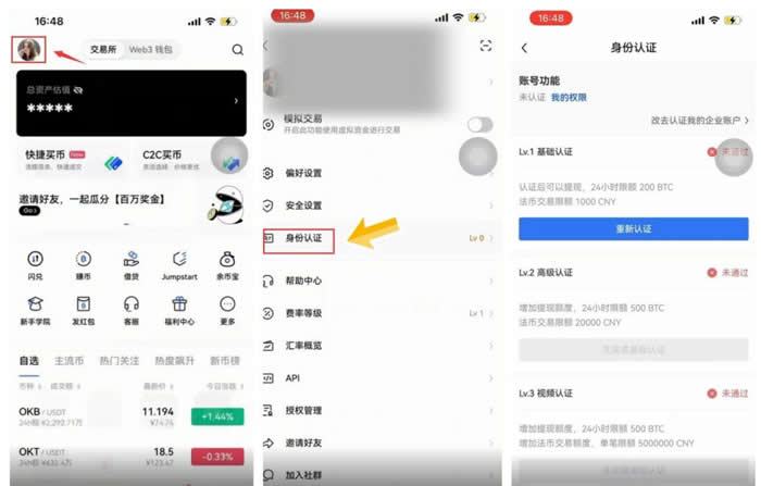 3.在首页点击左上角的【个人中心】在下方找到【身份认证】,在身份认证页面按照页面提示完成LV.1基础认证、LV.2高级认证和LV.3视频认证。