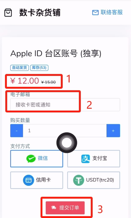 可以看到独享的台区账号只要12块钱,在下方输入一下你的邮箱,163邮箱、QQ邮箱都是可以的。然后点击【提交订单】,它就会自动跳转到它的微信支付页面。支付完成之后它就会把这个apple ID转到你的QQ邮箱或者是163邮箱了。
