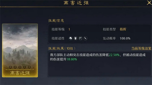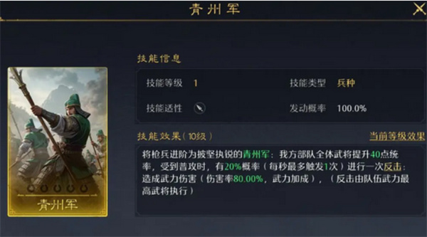 枪兵专属兵种技能,可提升反击次数并增加统率,同时兼顾增伤与减伤,是枪兵反击队的必带技能。