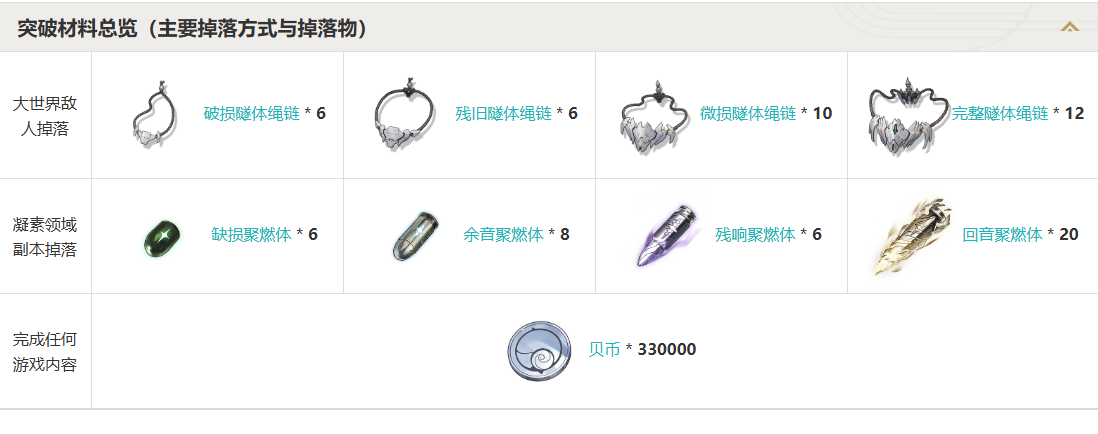 贝币×330000、破损隧体绳链×6、残旧隧体绳链×6、微损隧体绳链×10、完整隧体绳链×12、缺损聚燃体×6、余音聚燃体×8、残响聚燃体×6、回音聚燃体×20