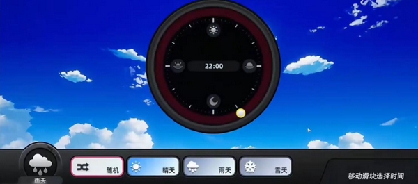 进入后可见顶部为24小时制模拟表盘,游戏内时间流速显著快于现实;其下方即为天气控制区,位于“拍照”图标正下方(注:此布局基于当前内测版本,公测阶段可能存在微调)。