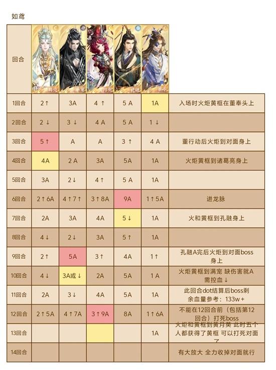 本表格适合伤害可能没那么高、12回合内打不完一次boss的血的练度。如果练度比表里更高,就要控血了。如果你打着打着发现没到12回合boss就没了,那可能找别的攻略更能帮到你一点。