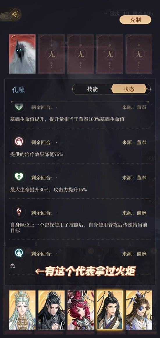 如果忘记某个密探是否拿过火炬,或者分辨不出屏幕里那个黄框是密探准备好开大了,还是拿过火炬才变黄的话,可以点开详情查看状态,有【光】的就是拿过火炬的,也就是有黄框的。如图4。