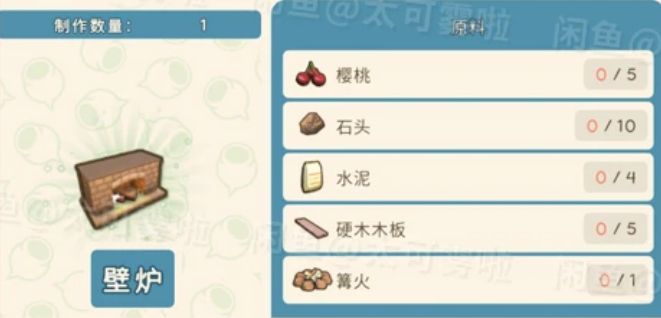樱桃*5、石头*10、水泥*4、硬木模板*5、篝火*1