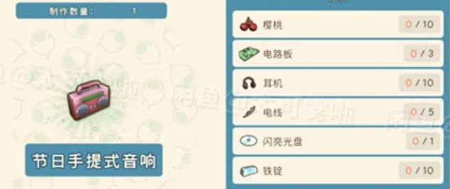 樱桃*10、电路板*3、耳机*10、电线*5、闪亮光盘*1、铁锭*10