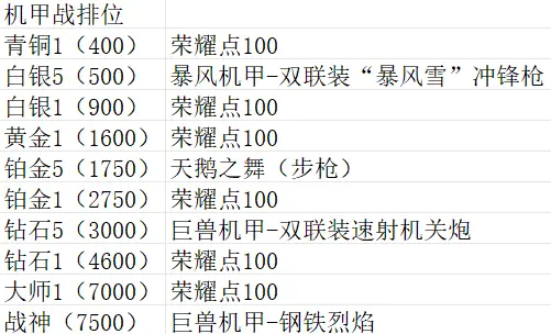 逆战未来机甲排位赛段位划分及分数要求,完成排位赛比赛获得排位分,分数达到要求时将获得段位晋升。机甲排位赛与猎场排位赛分开计算,排位赛大段位分为:青铜、白银、黄金、铂金、钻石、大师、战神、巅峰战神,巅峰战神除了排位分要求外,仅前200名最强选手可获得此殊荣
